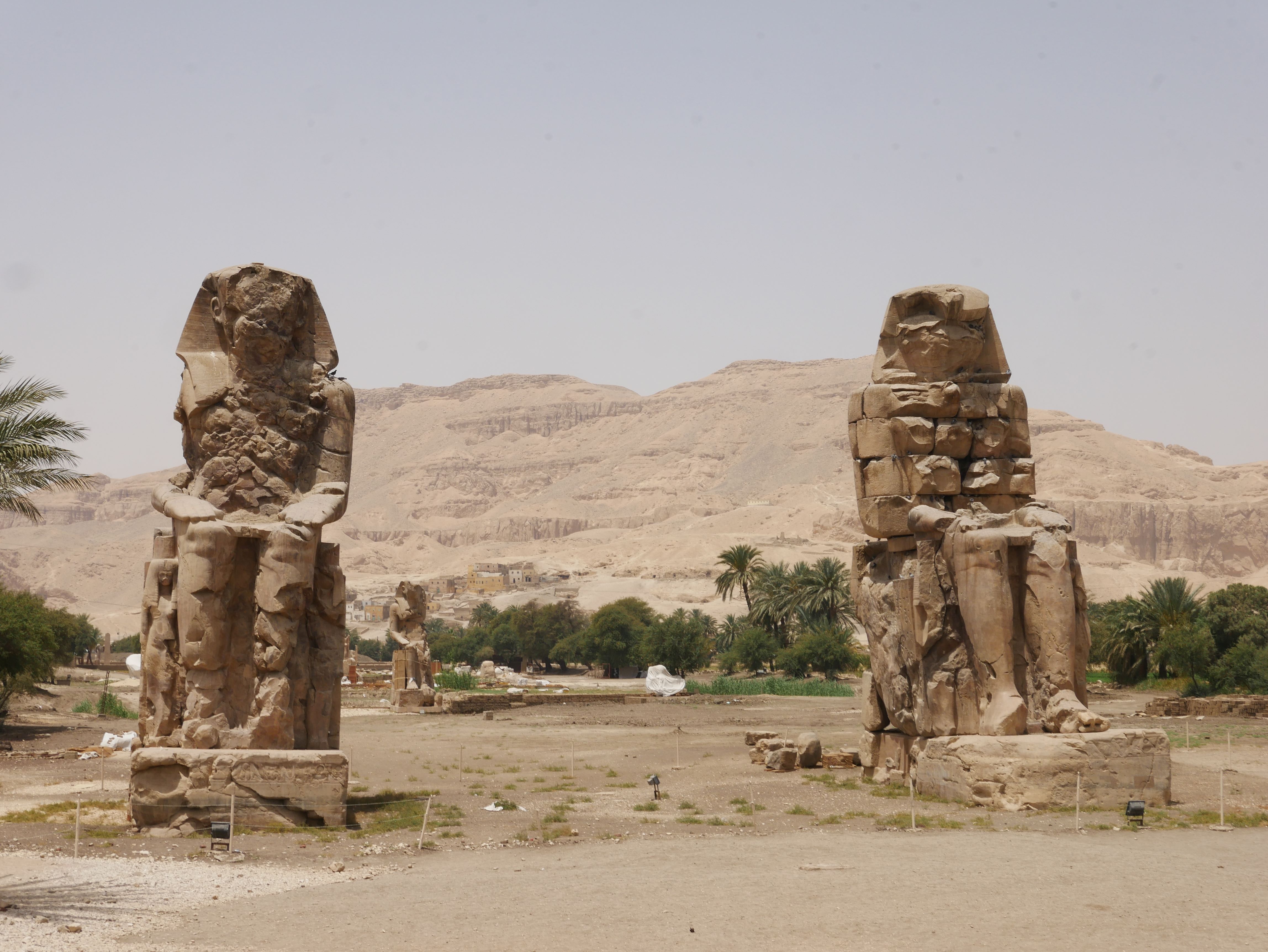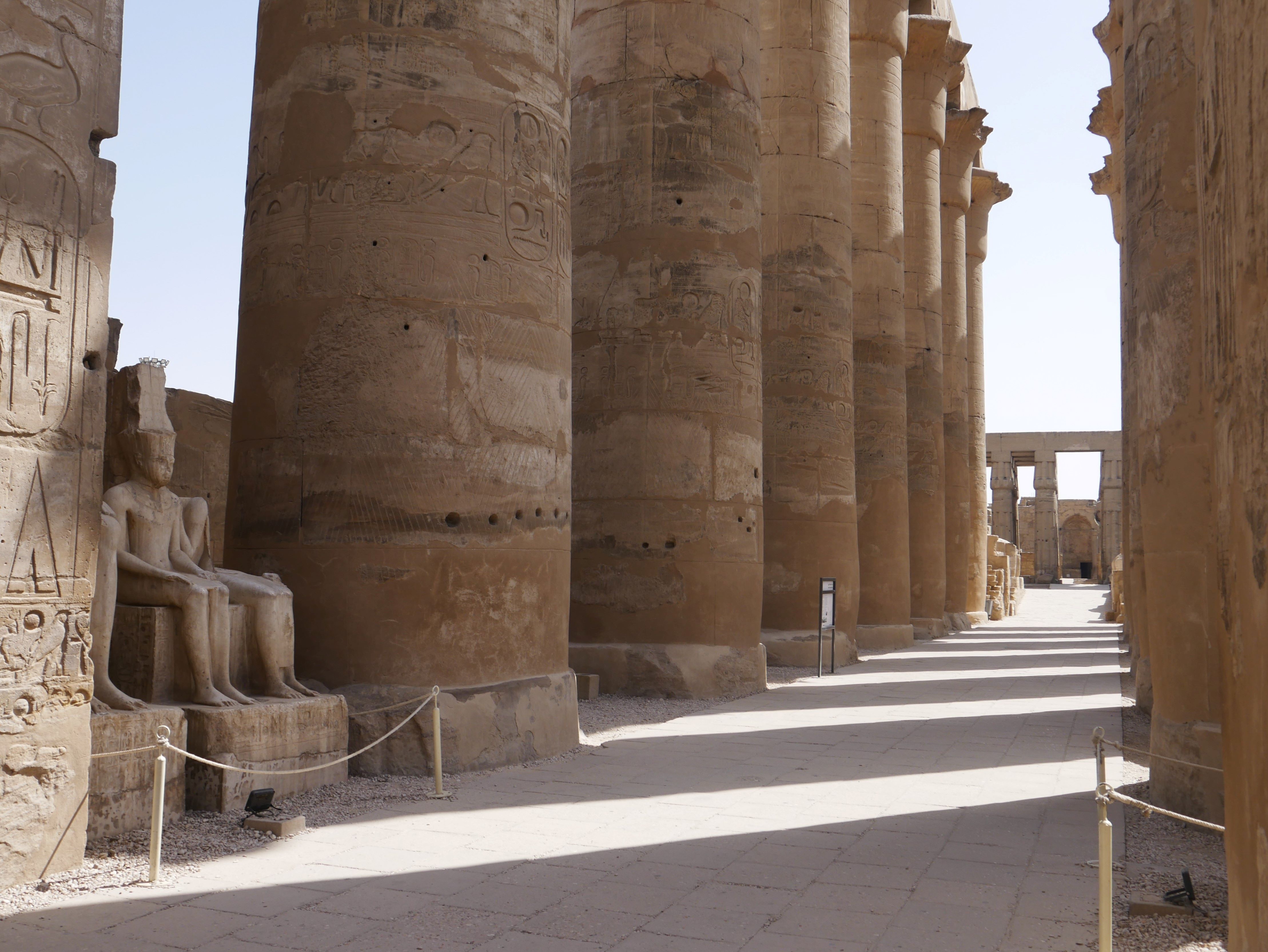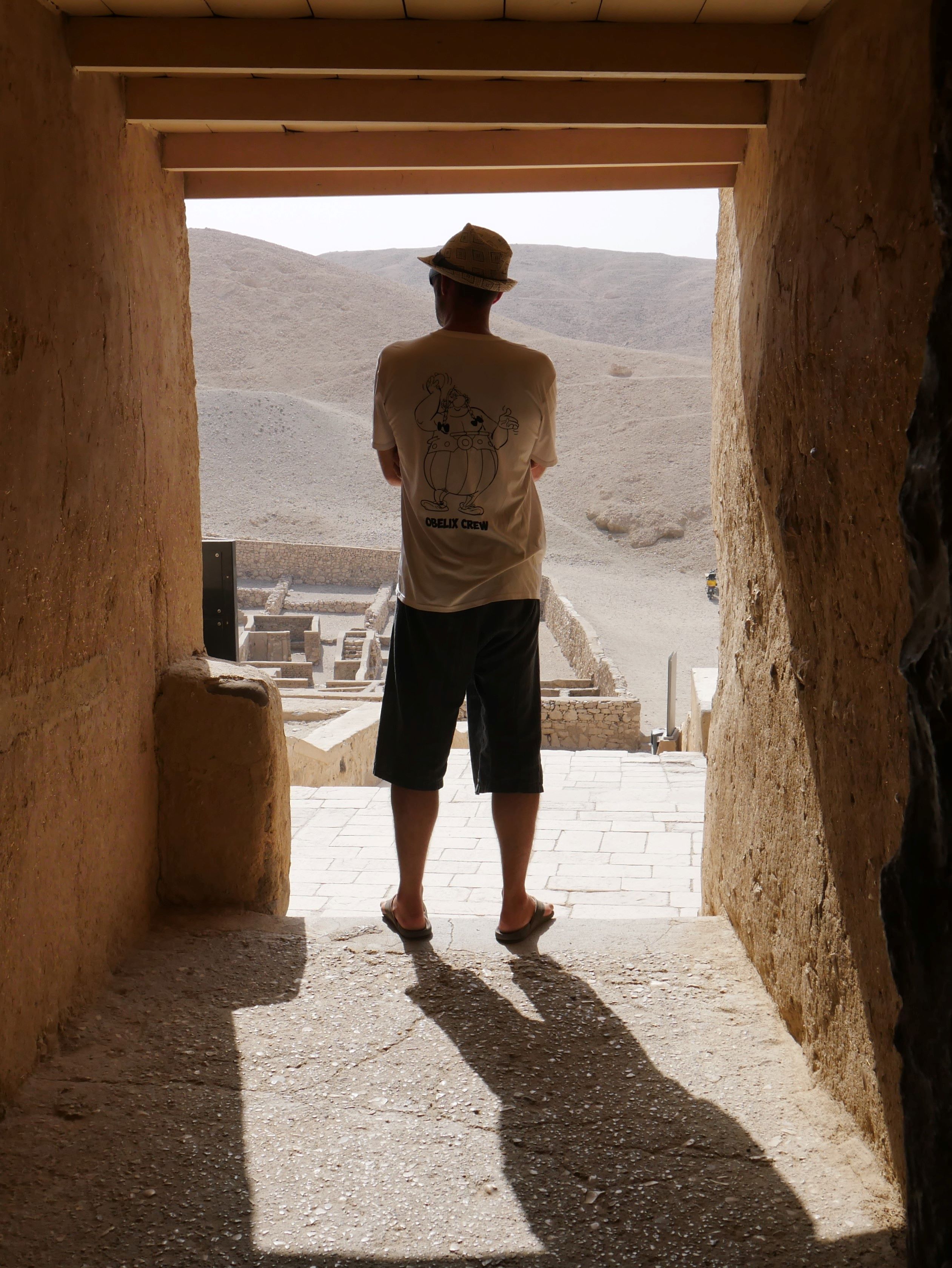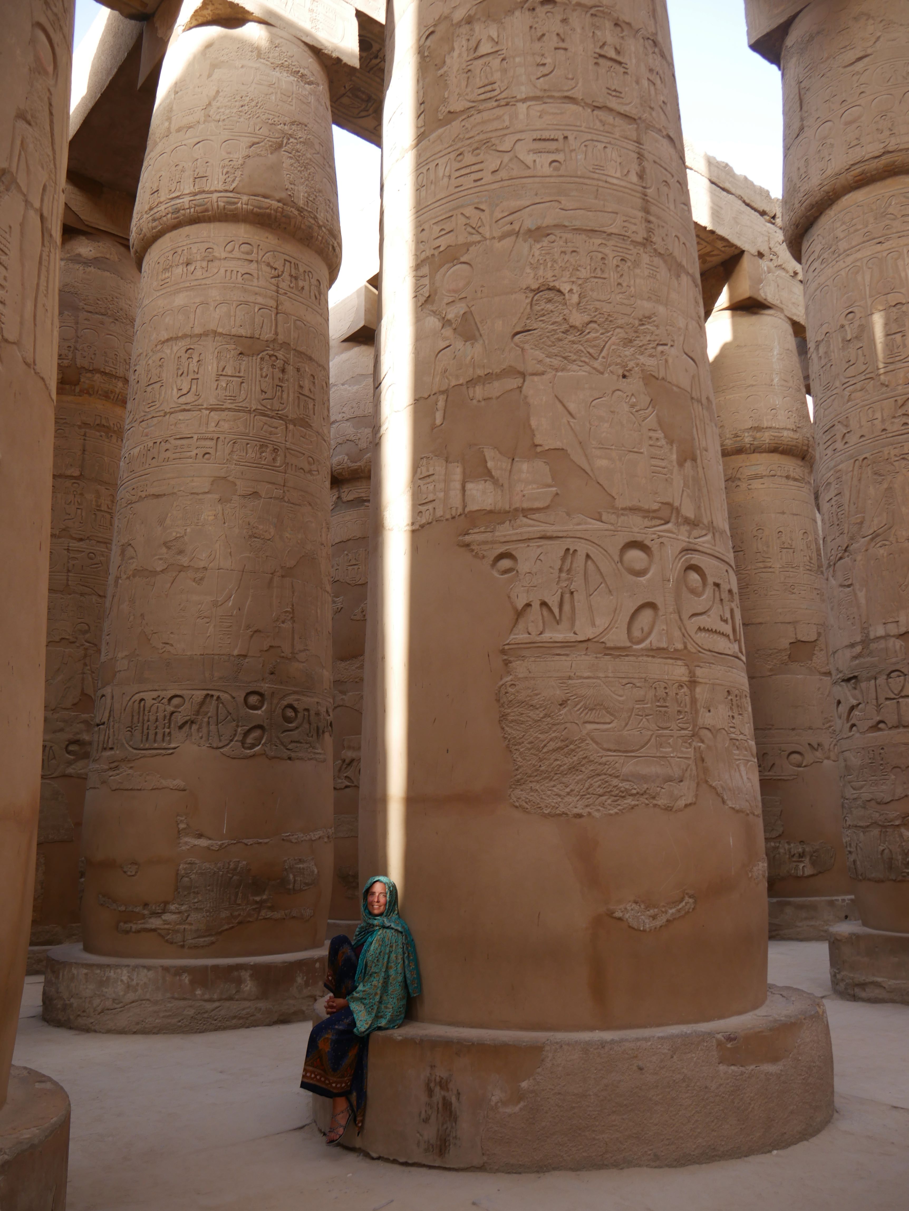 Après avoir triomphé de notre partie de 1-2-3- soleil avec le vent sur la Mer Rouge, donc, les enfants ont été ravis de jouer à cache-cache dans les temple de Louxor, Karnak et Hatchepsut, savourer les mille et un délices du buffet du petit déjeuner de l’hôtel Iberotel, et les mezze des différents restaurants bon marché du coin (El Kababgy, Sofra et Al Shahaby Lane), chahuter bruyamment dans la piscine découverte flottant sur le Nil, admirer les peintures des dieux et animaux mythiques, des ciel bleus étoilés, et des pictogrammes mystérieux, apprendre les rudiments de l’alphabet hiéroglyphe grâce à notre troisième guide Mohammed, dit Momo, s’extasier avec lui de la finesse des hauts-reliefs ciselés du couple aux cheveux frisés du tombeau de Ramose, et écouter avidement les histoires de pharaons, notamment du déclin de l’Empire sous Akhenaton, visionnaire ou mécréant monothéiste, c’est selon, et du sacrement de la reine Hatchepsut, beauté fatale représentée en homme avec des oreilles de vache, qui régna pendant plus de vingt ans, et dont le beau-fils Thutmose III et le petit fils Amenhotep n’ont eu de cesse de défigurer toutes les statues et peintures à son effigie après sa mort. Comme quoi sexisme et jalousie ne datent pas d’hier.