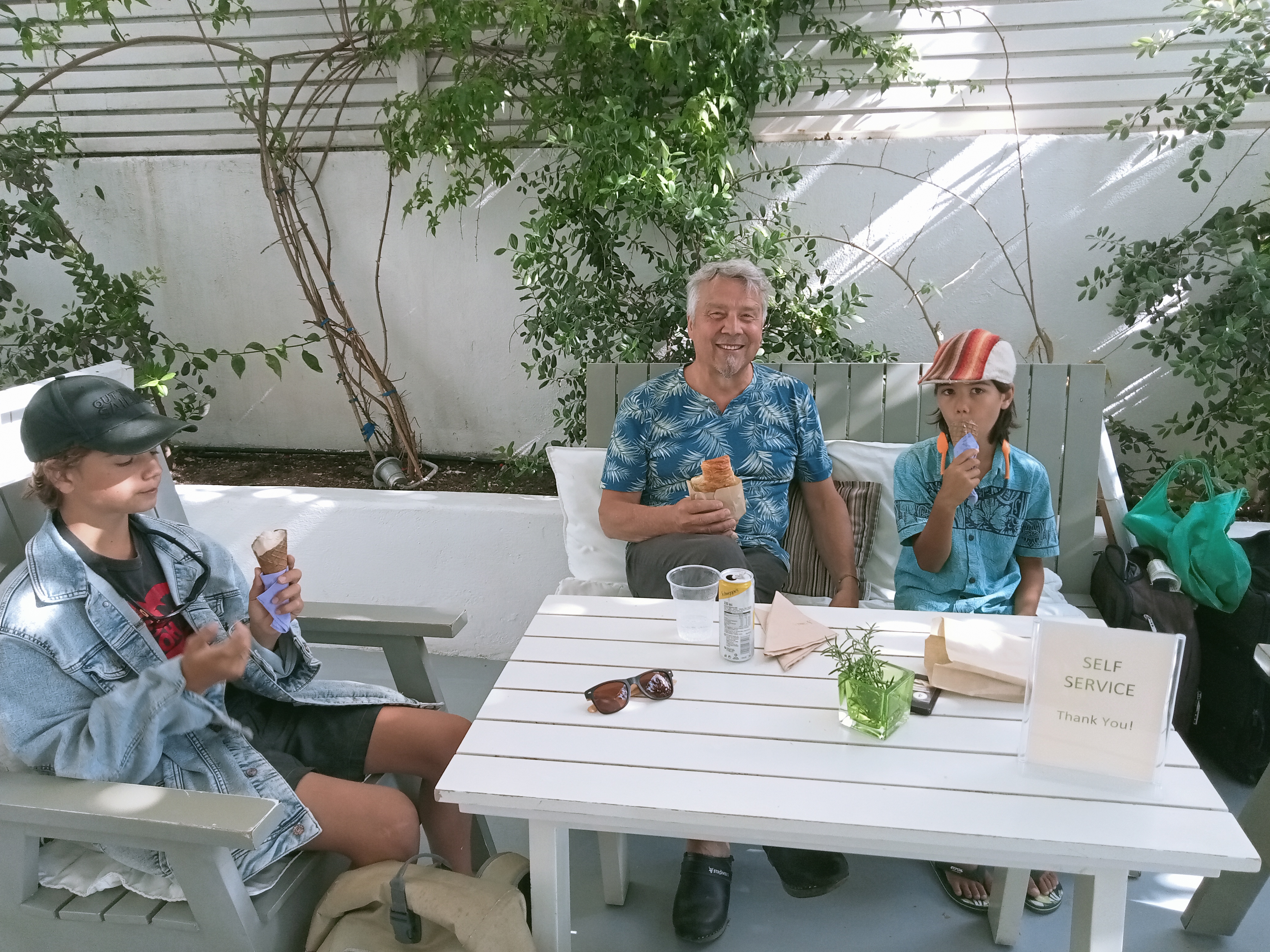When I return five days later with Dad, after my brother civil union celebration, Thomas and the kids have spent their time fixing stuff on Obelix and relocating it to Perissa, another coastal village with a black sand beach.