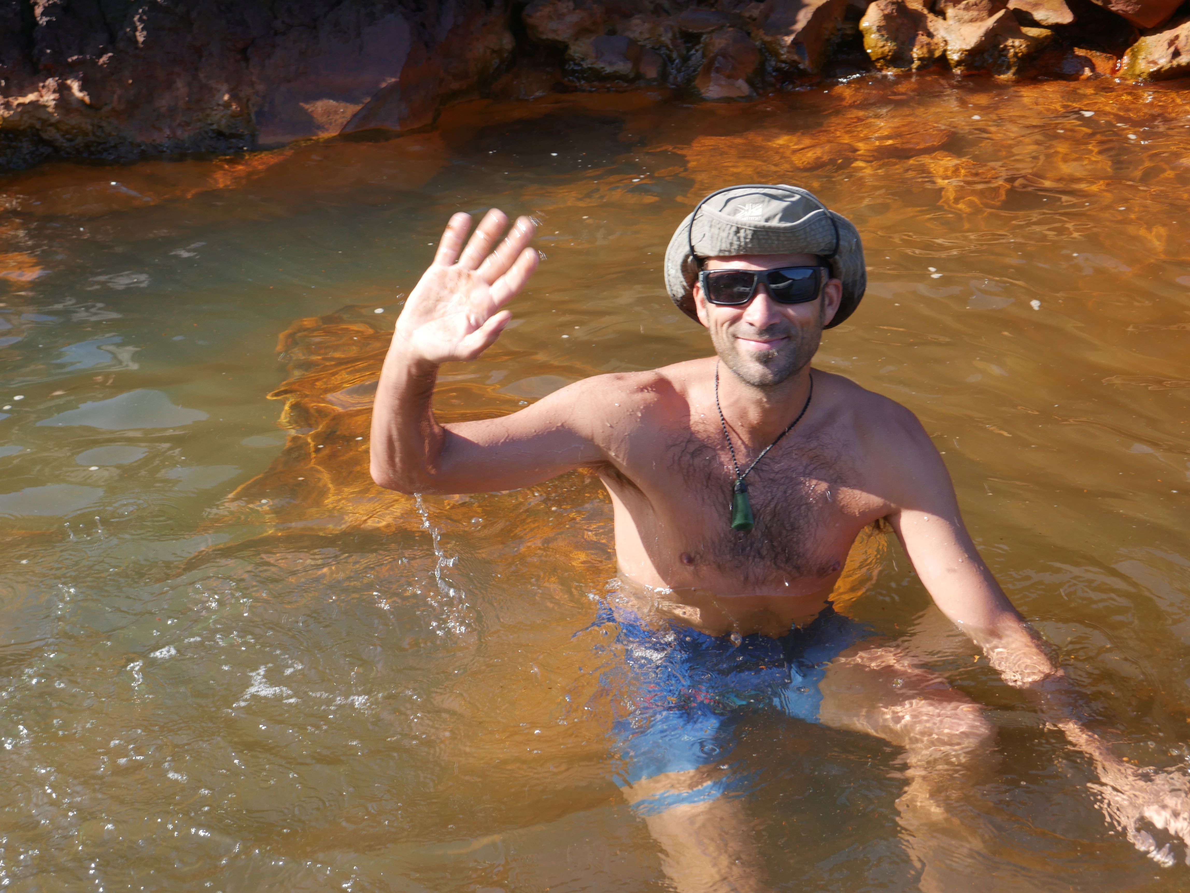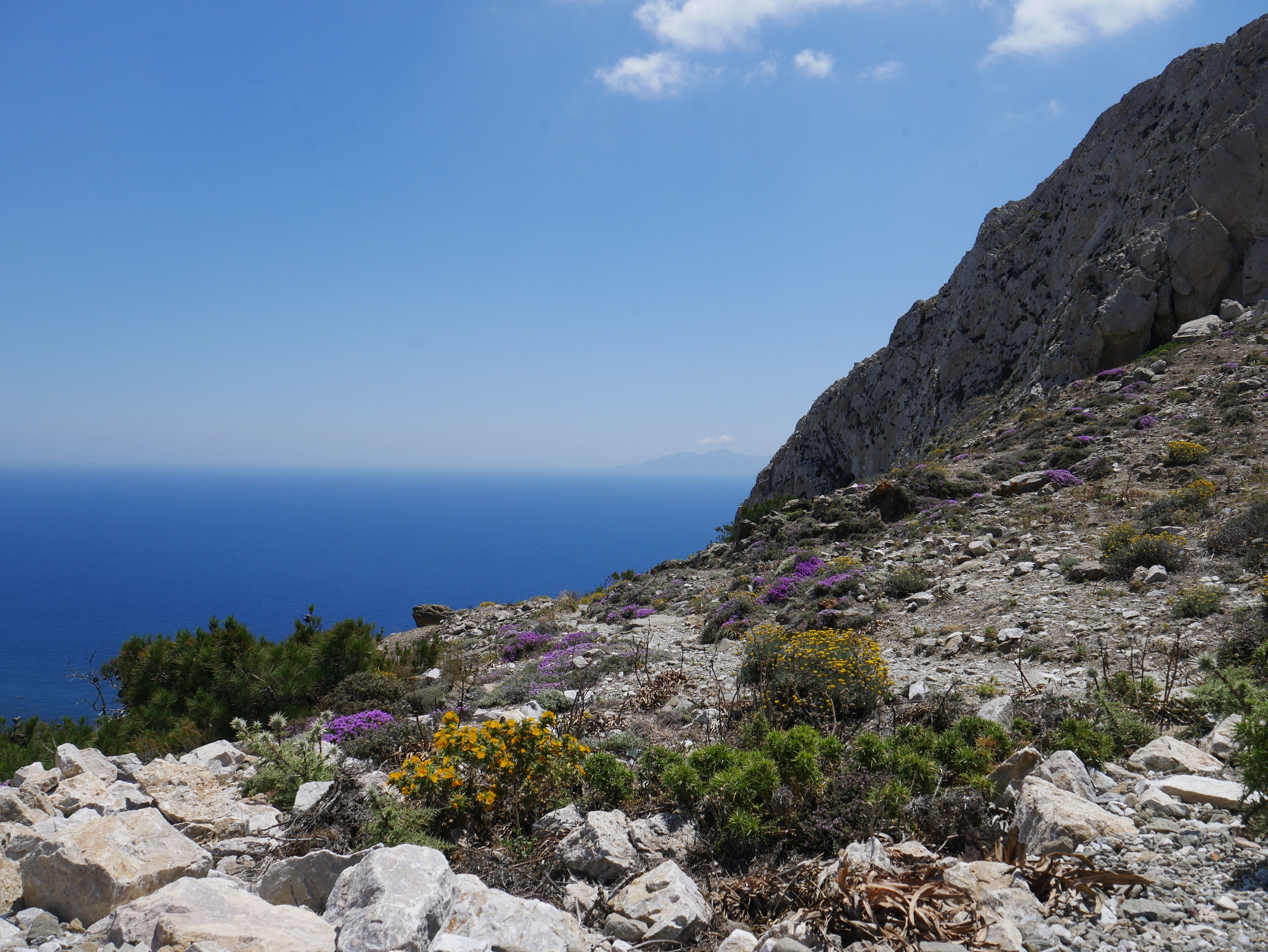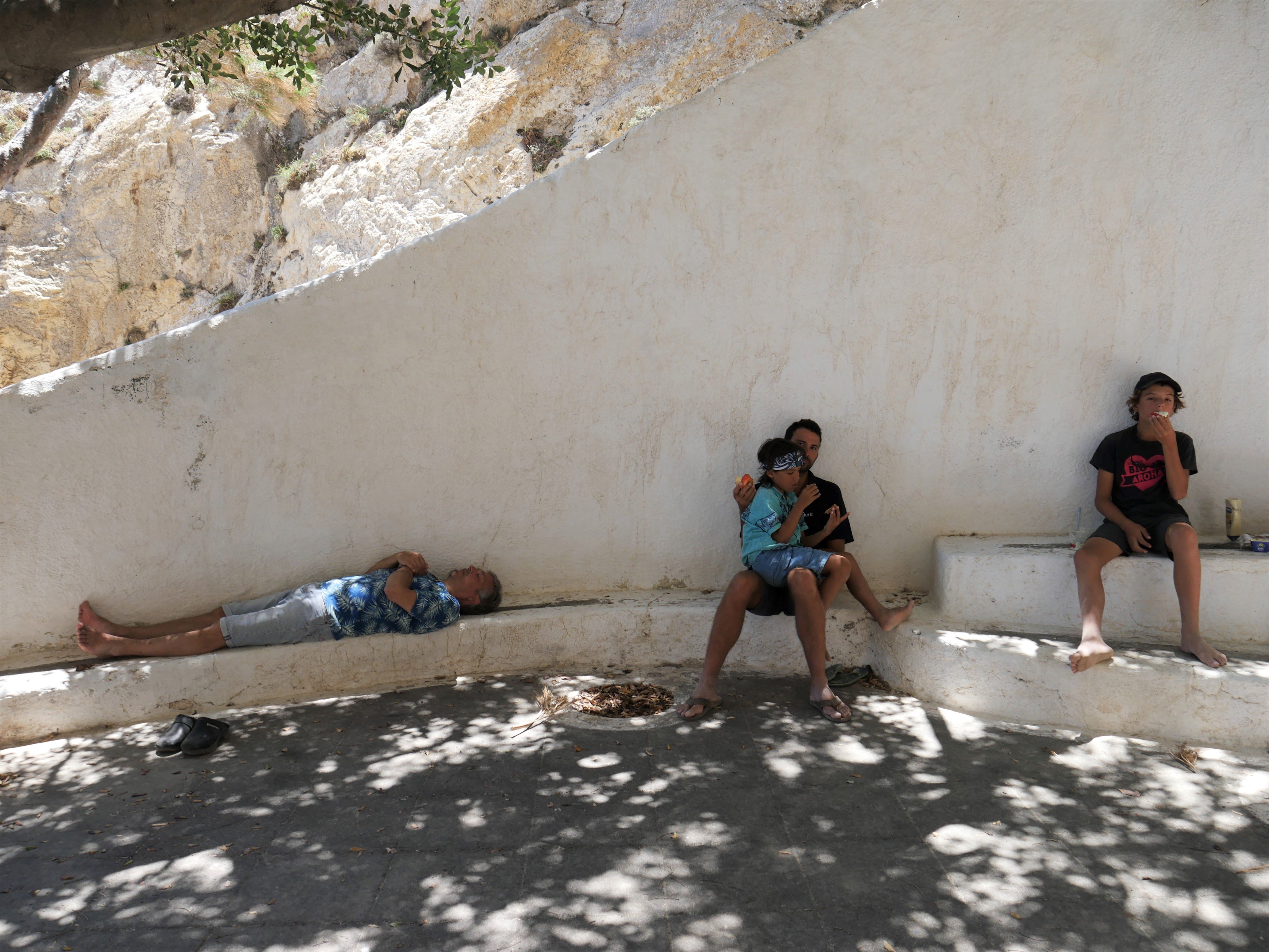 The wind forces us to extend our stay in Santorini for a couple of nights, and despite the main villages drowning under mass tourism (Thera and Oia), we manage to escape the crowd at the less popular sites and hike virtually alone between Perissa and Kamari, visit the island sole fresh water source (ridiculously insufficient for the island’s current needs, and thus supplemented by winter rain water collection but mainly desalination plants to cope with tourism development) where we have lunch without meeting a soul, jump in the water off a cliff (which access is disputed with a TV crew shooting a commercial that day), race through a scree of pumice stones and finally bath in supposedly-hot-but-rather-lukewarm springs on our last morning, on our way to Folegandros.
