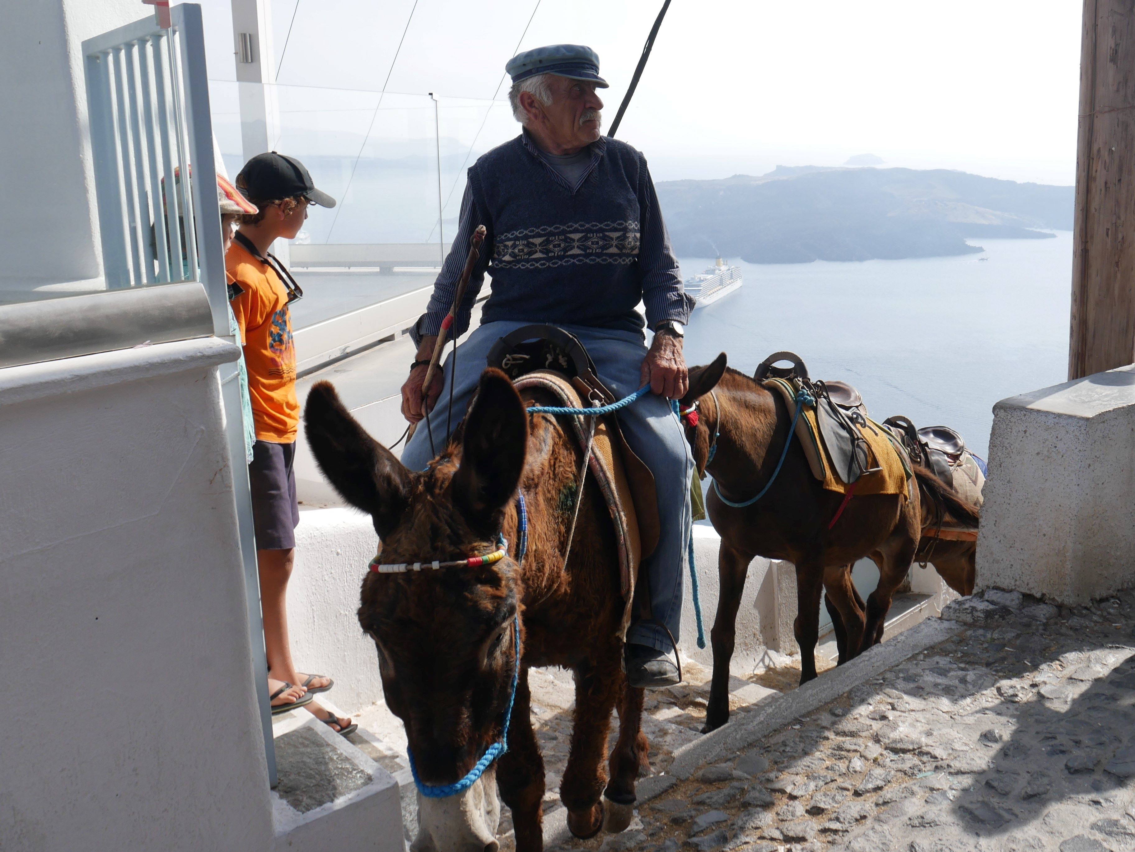 Finally anchored in Akrotiri, a small fishing settlement in the South of the island, relatively quiet albeit rolly, and still surrounded by thirty or so boats, we spend the afternoon with my uncle Dominique, who, after holidaying in several locations we’ve visited over the past year, happens to be sightseeing in Greece, for once with impeccable timing. He picks us up from the red caldera with his rental car for a walk in the village of Thera (a.k.a Fira) where we elbow our way through the narrow streets and stairs amongst sightseers of all nationalities (amongst which our Slovenian friends Staša and Borjan), as well as donkeys, and have an early dinner at a taverna terrace, hopeful to witness Santorini’s praised sunset, regrettably concealed by heat fog.