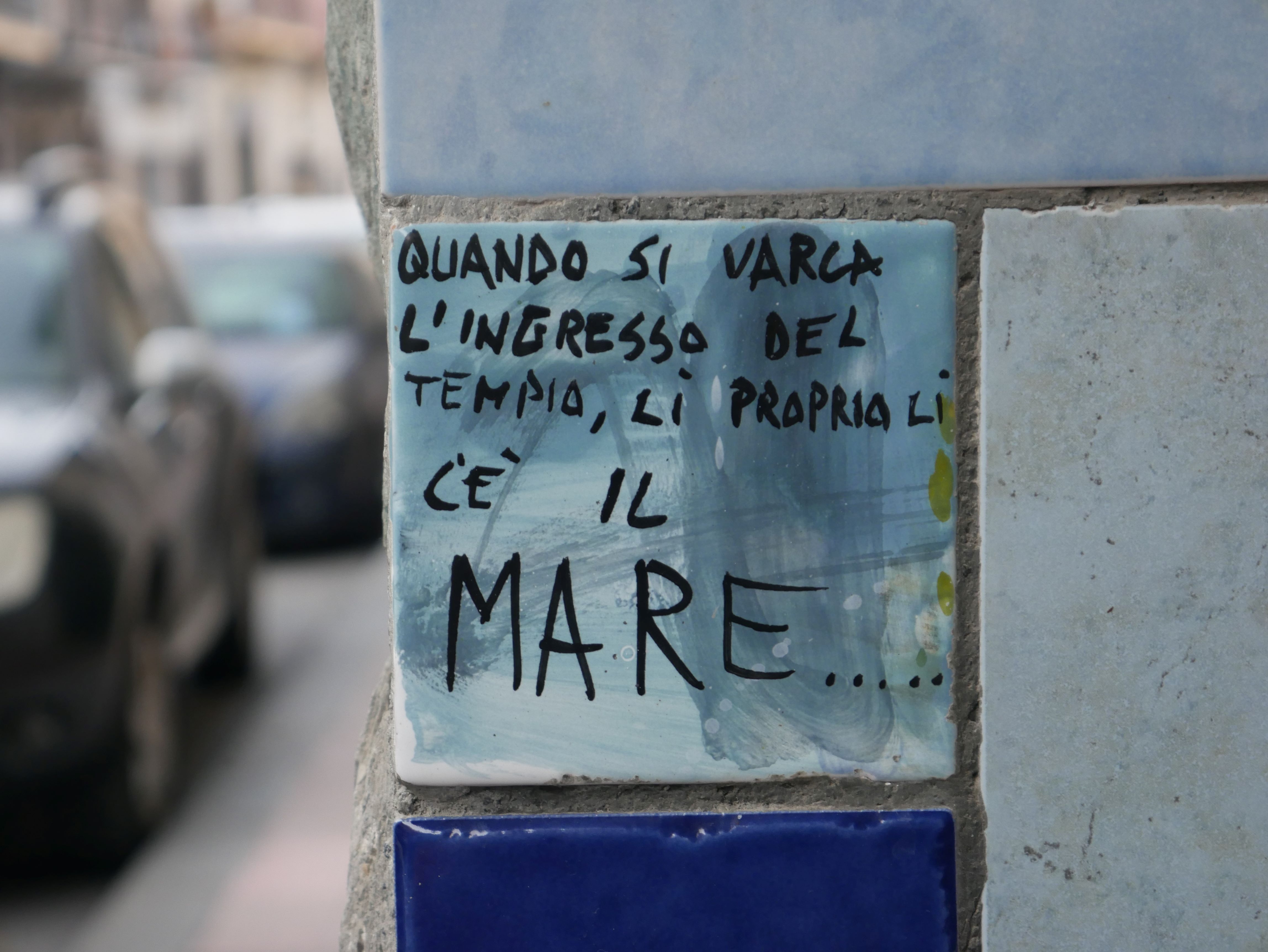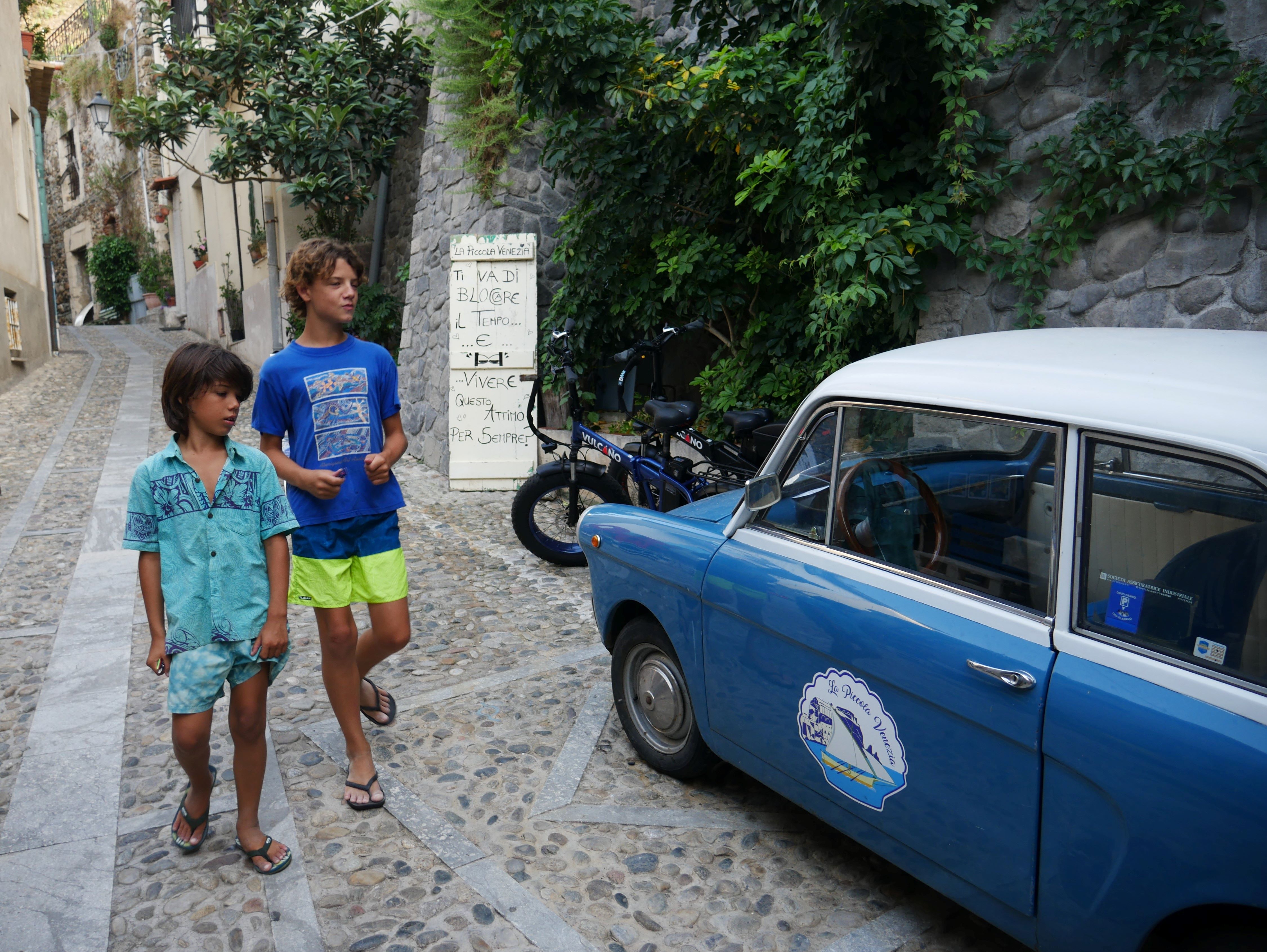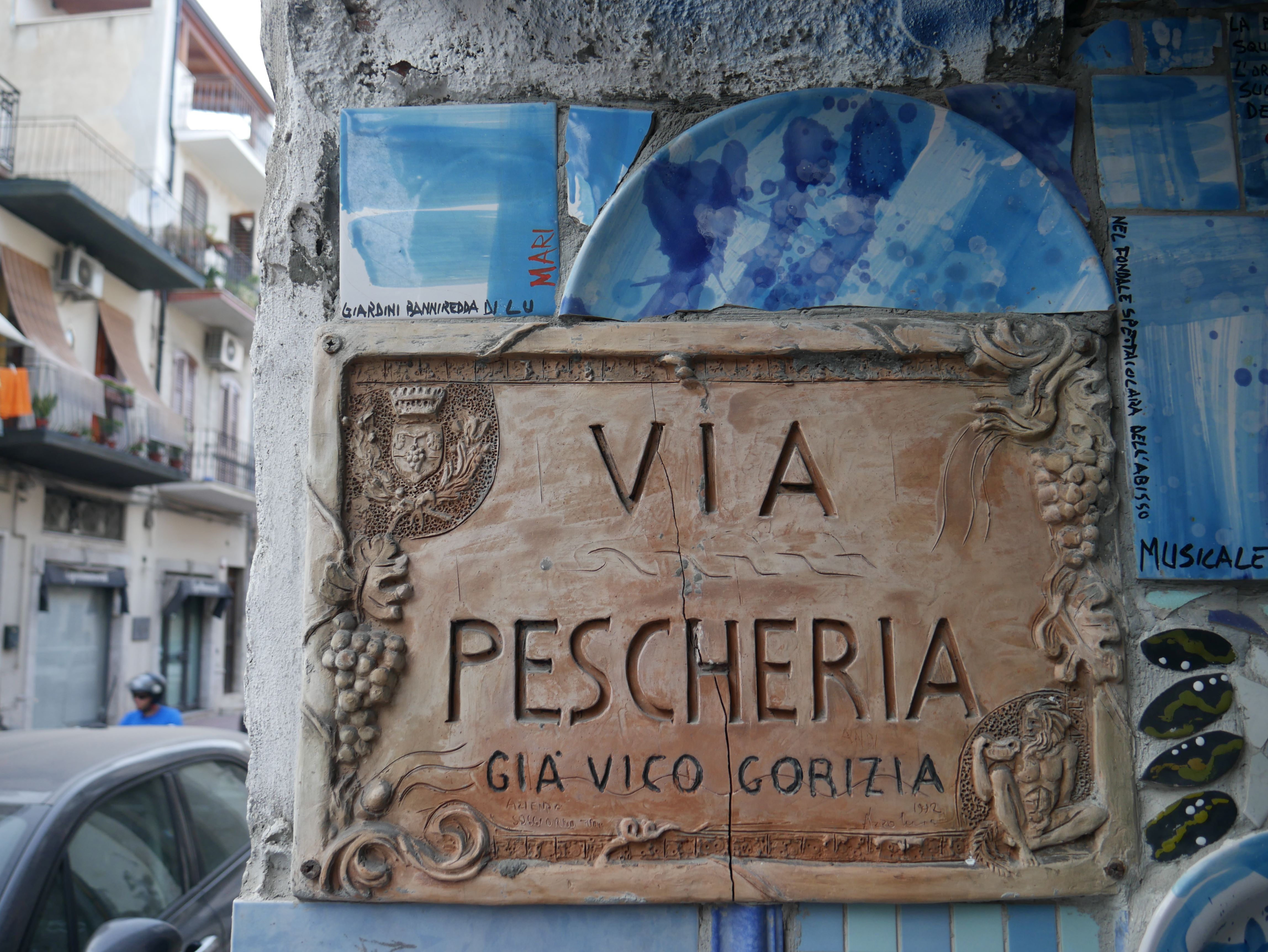 Subissant la canicule, nous restons à bord, ou dans l’eau, jusqu’en fin d’après-midi puis partons à la découverte du front de mer, suivant notre instinct dans ce décor insolite et contrasté, entre la majestuosité de la baie, et de la colline à laquelle est suspendue la ville de Taormina, et les façades pas rénovées depuis les années 70 avec climatiseurs apparents et mosaïques douteuses, tout ça sur bande-son bruyante de voitures, vespa et sirènes de pompier ou d’ambulance qui sévissent jour et nuit. Une fois, le soleil bas sur l’horizon, il fait bon vivre dans les rues de Naxos et nous ne résistons pas à l’appel des pizzes pour célébrer notre arrivée en Sicile, ni à celui de la crème glacée servie à la spatule et sommes conquis par le Profumo di Sicilia qui marie fraicheur du citron, crèmeux de l’amande et morceaux de pistache croquants, le tout relevé par une note de cannelle.