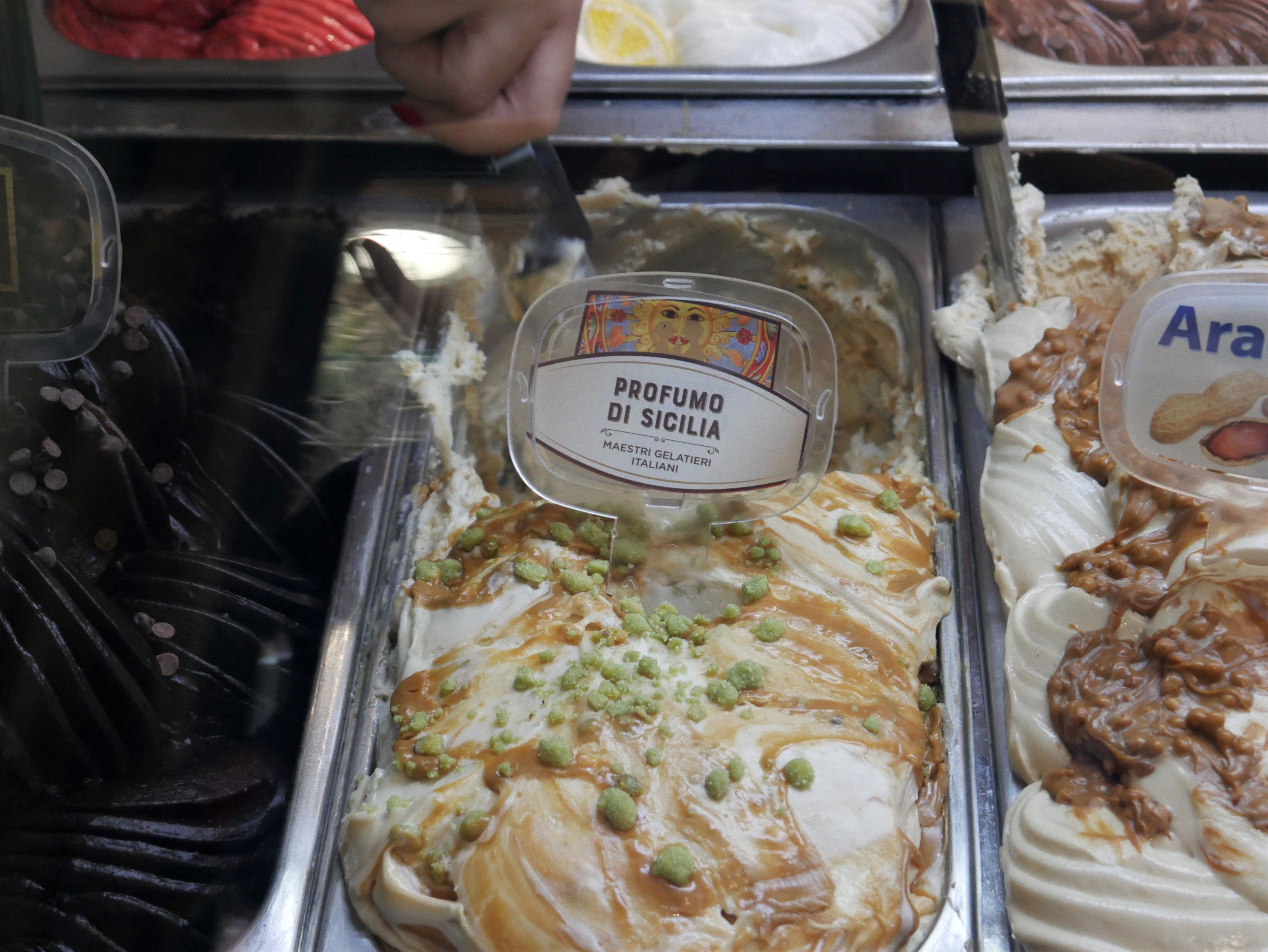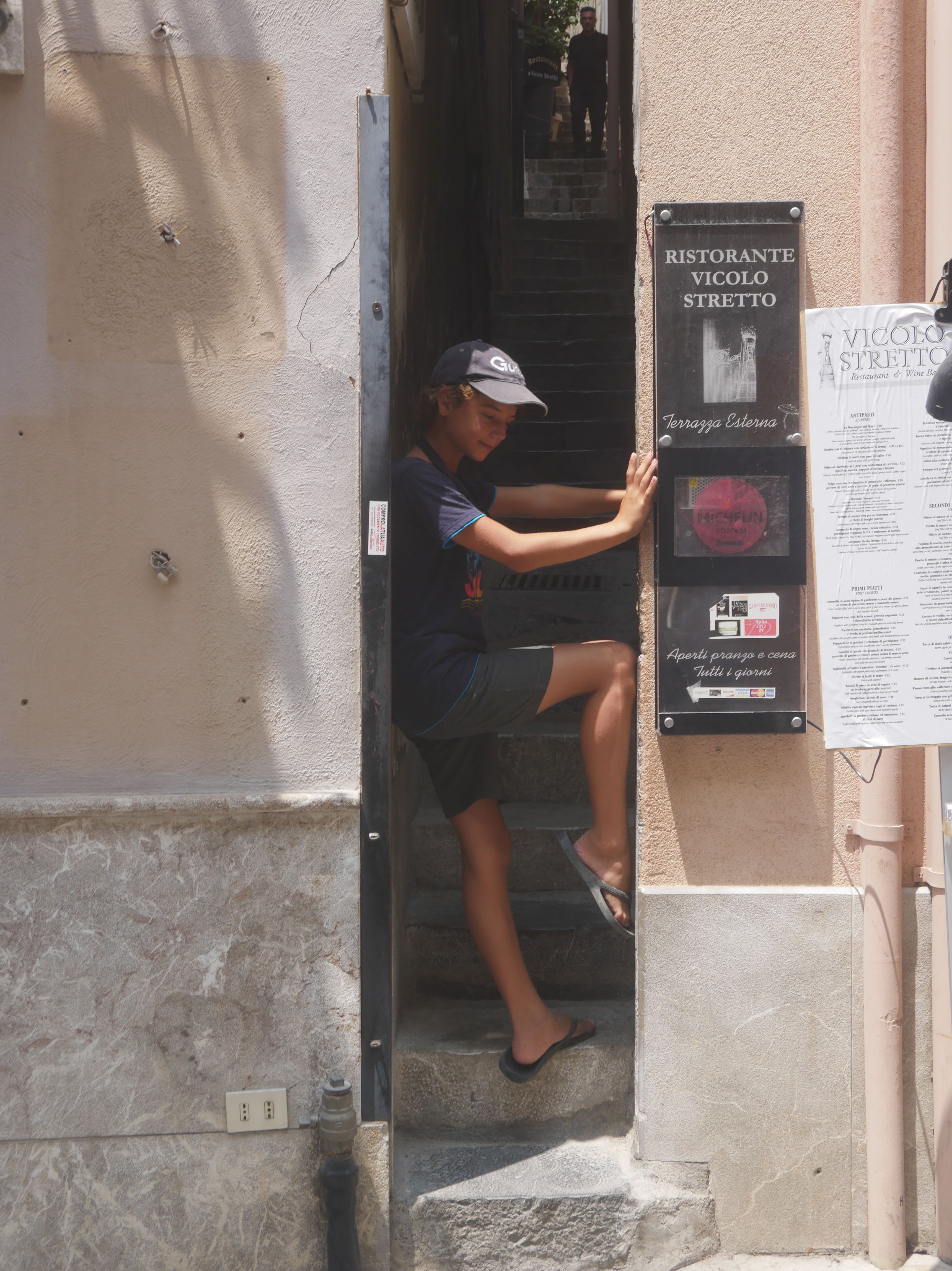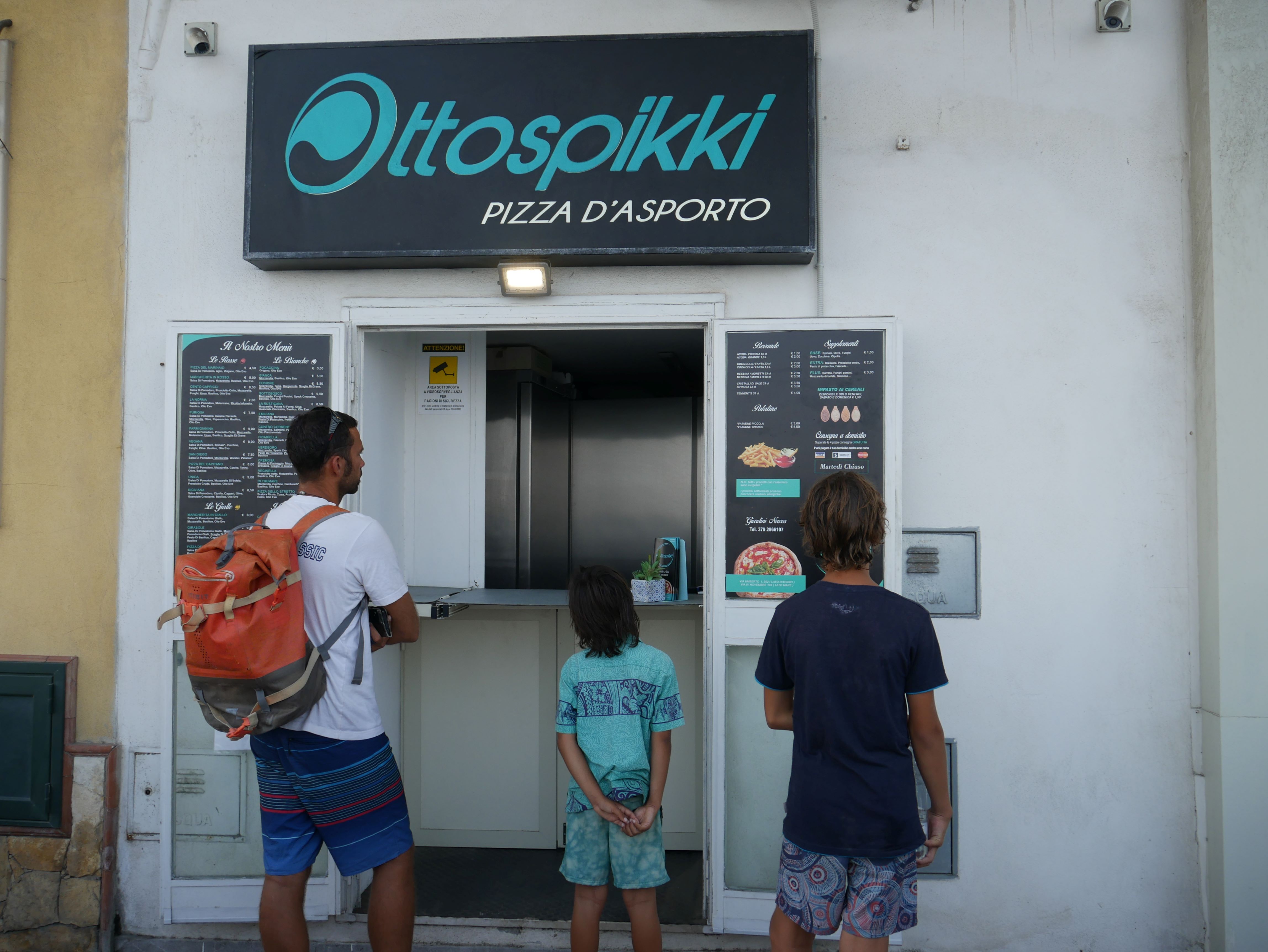 Subissant la canicule, nous restons à bord, ou dans l’eau, jusqu’en fin d’après-midi puis partons à la découverte du front de mer, suivant notre instinct dans ce décor insolite et contrasté, entre la majestuosité de la baie, et de la colline à laquelle est suspendue la ville de Taormina, et les façades pas rénovées depuis les années 70 avec climatiseurs apparents et mosaïques douteuses, tout ça sur bande-son bruyante de voitures, vespa et sirènes de pompier ou d’ambulance qui sévissent jour et nuit. Une fois, le soleil bas sur l’horizon, il fait bon vivre dans les rues de Naxos et nous ne résistons pas à l’appel des pizzes pour célébrer notre arrivée en Sicile, ni à celui de la crème glacée servie à la spatule et sommes conquis par le Profumo di Sicilia qui marie fraicheur du citron, crèmeux de l’amande et morceaux de pistache croquants, le tout relevé par une note de cannelle.