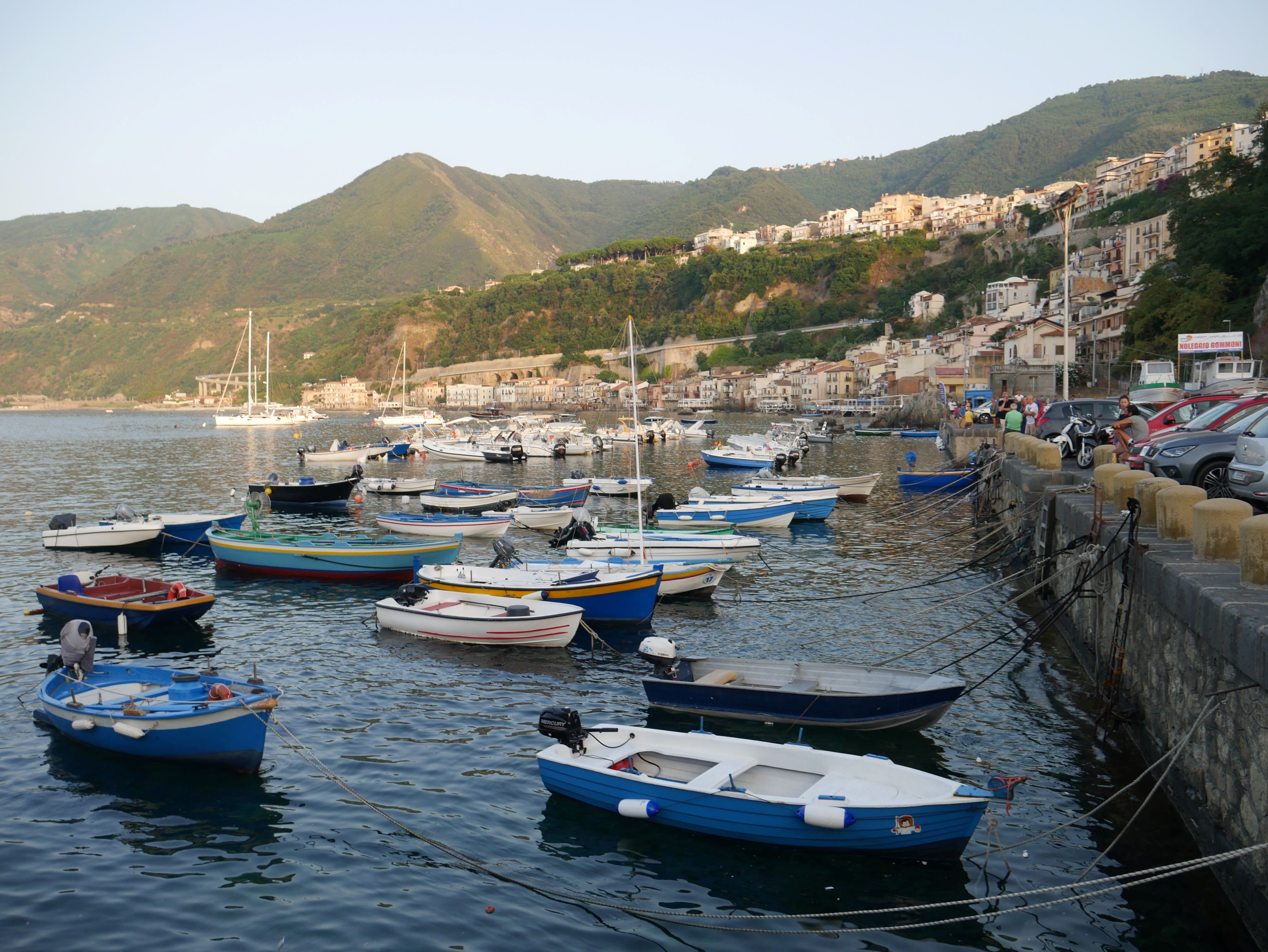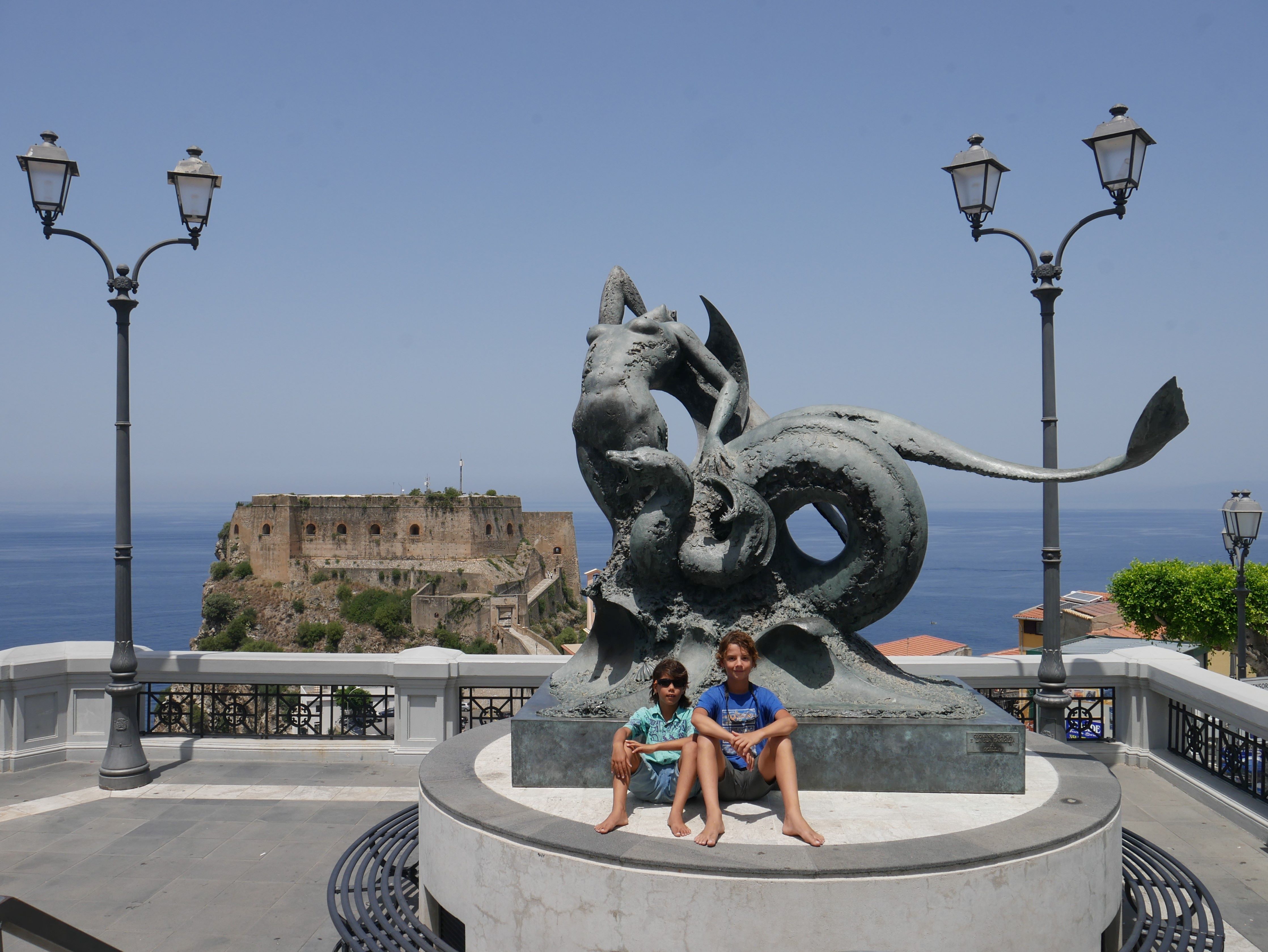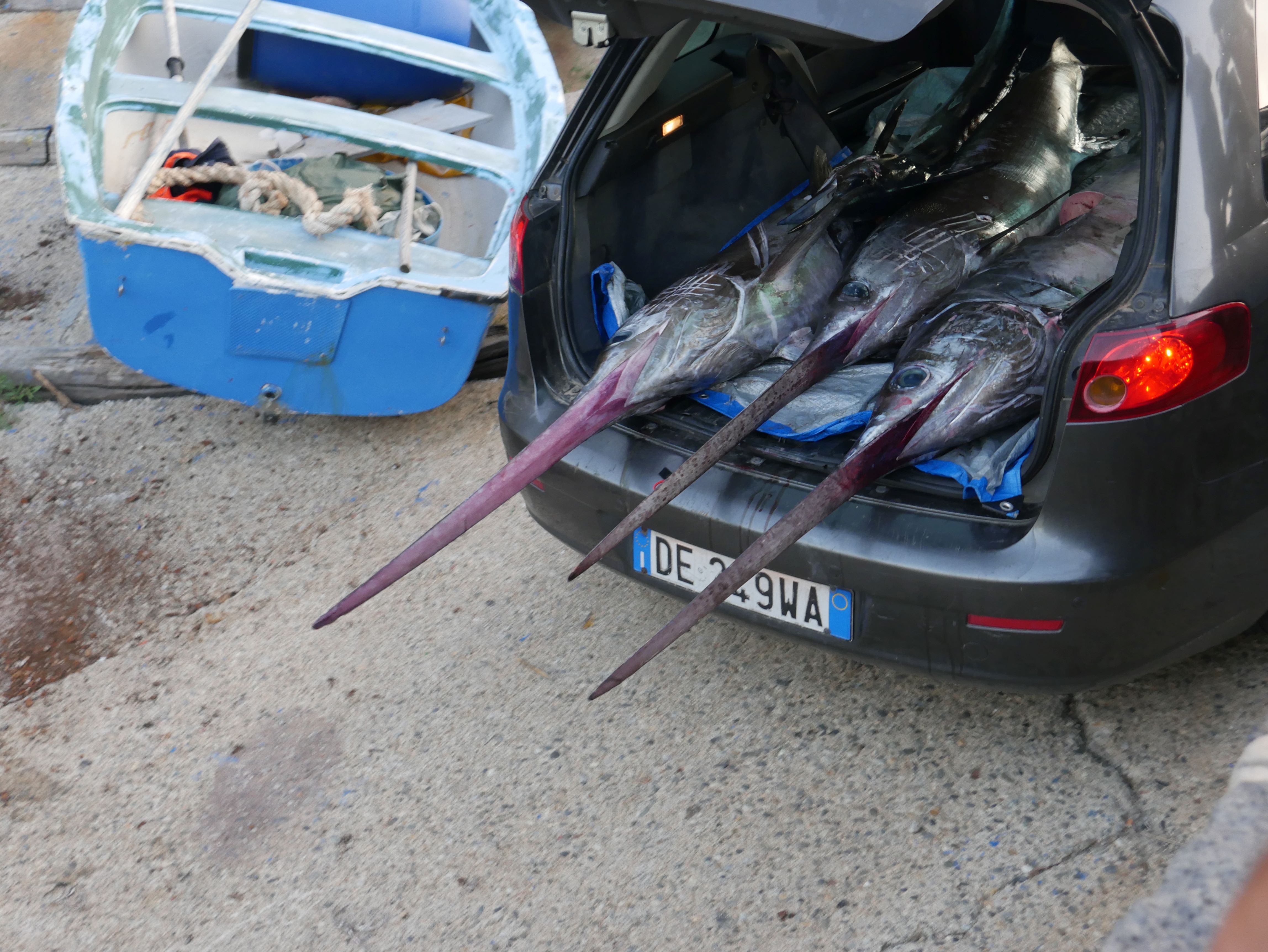 Pas le temps de s’appesantir car une fenêtre météo se présente pour traverser le détroit de Messine et nous filons donc à Scilla, pour deux petites nuits, juste le temps de faire des ricochets sur la plage, comme à l’accoutumée, flâner dans les rues escarpées, poser devant la statue de Scilla, jouer avec le soleil couchant, et s’émouvoir devant des espadons fraichement péchés (spécialité locale) et reposant tristement dans le coffre d’une voiture, avant de continuer vers les iles éoliennes.