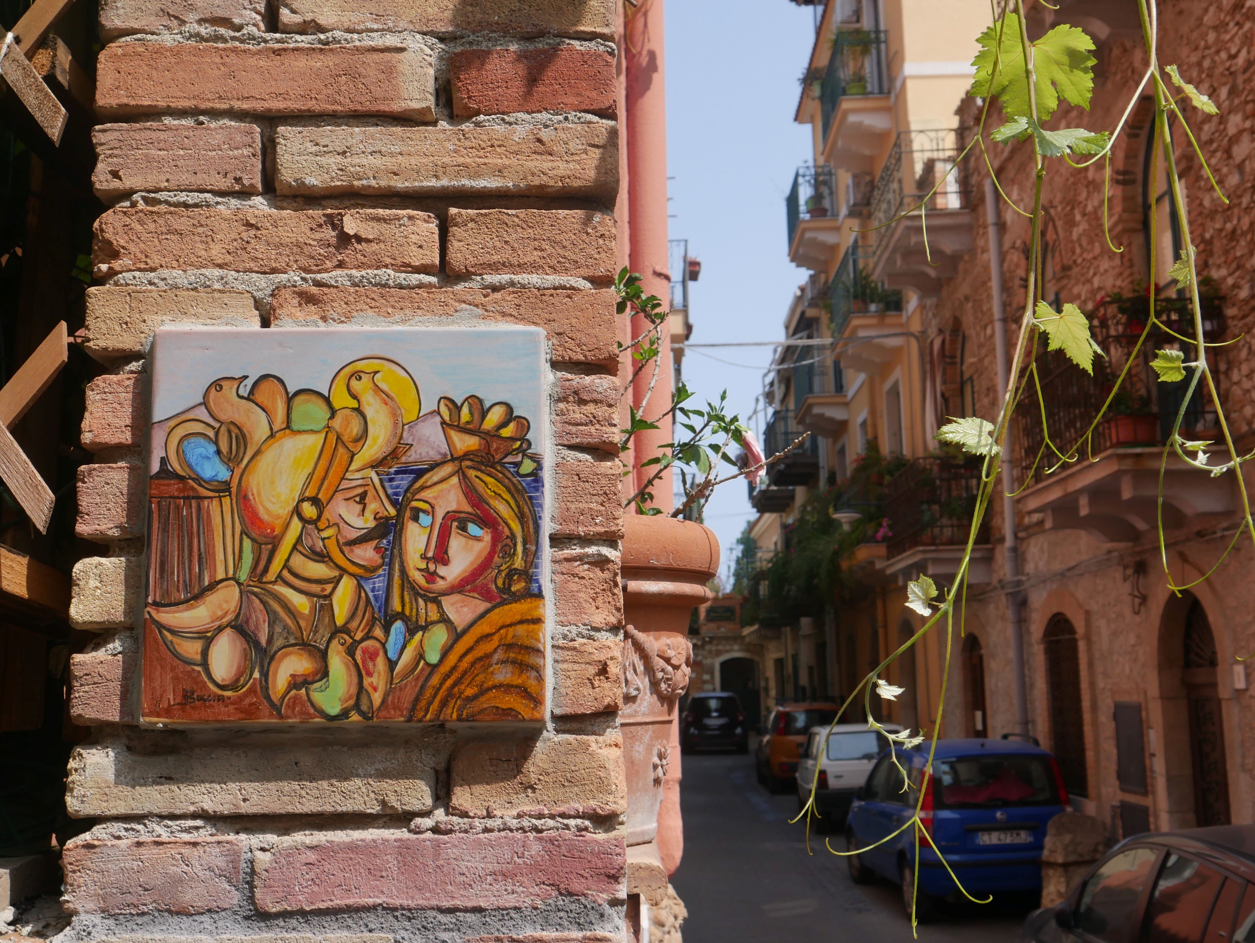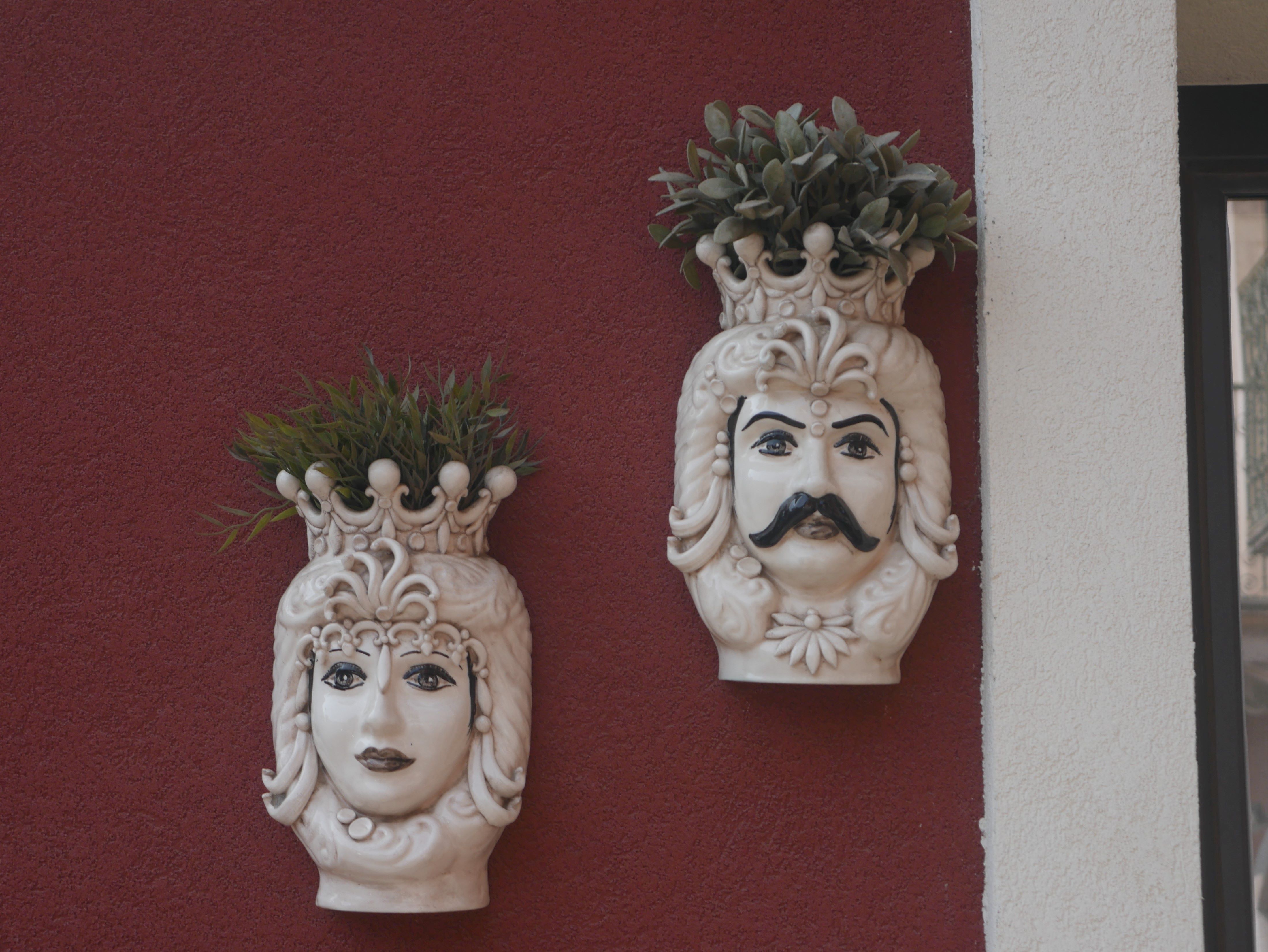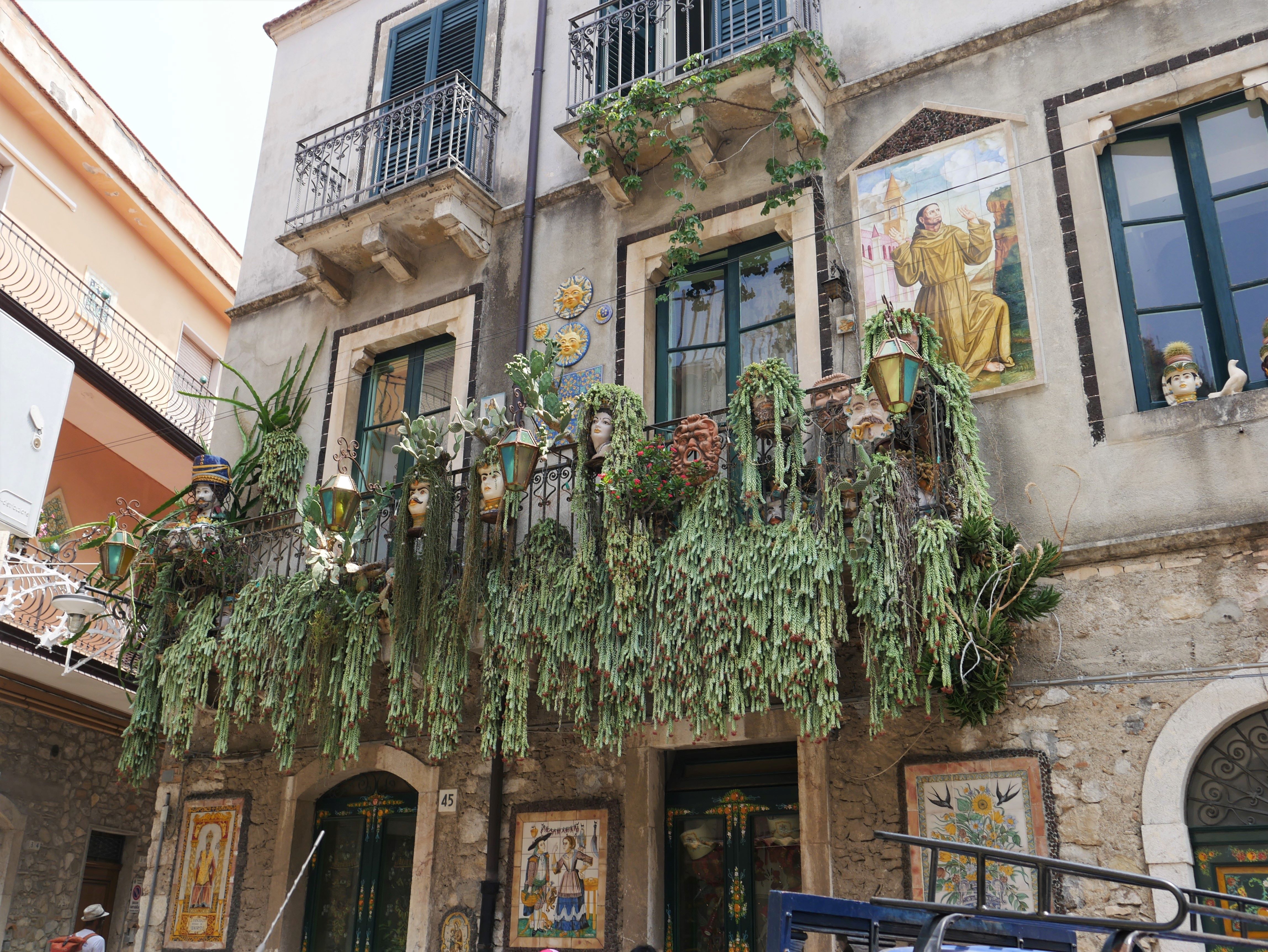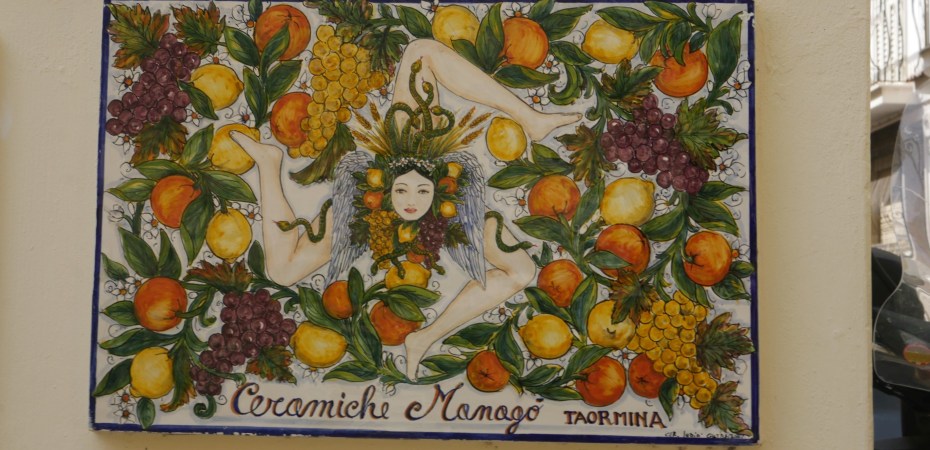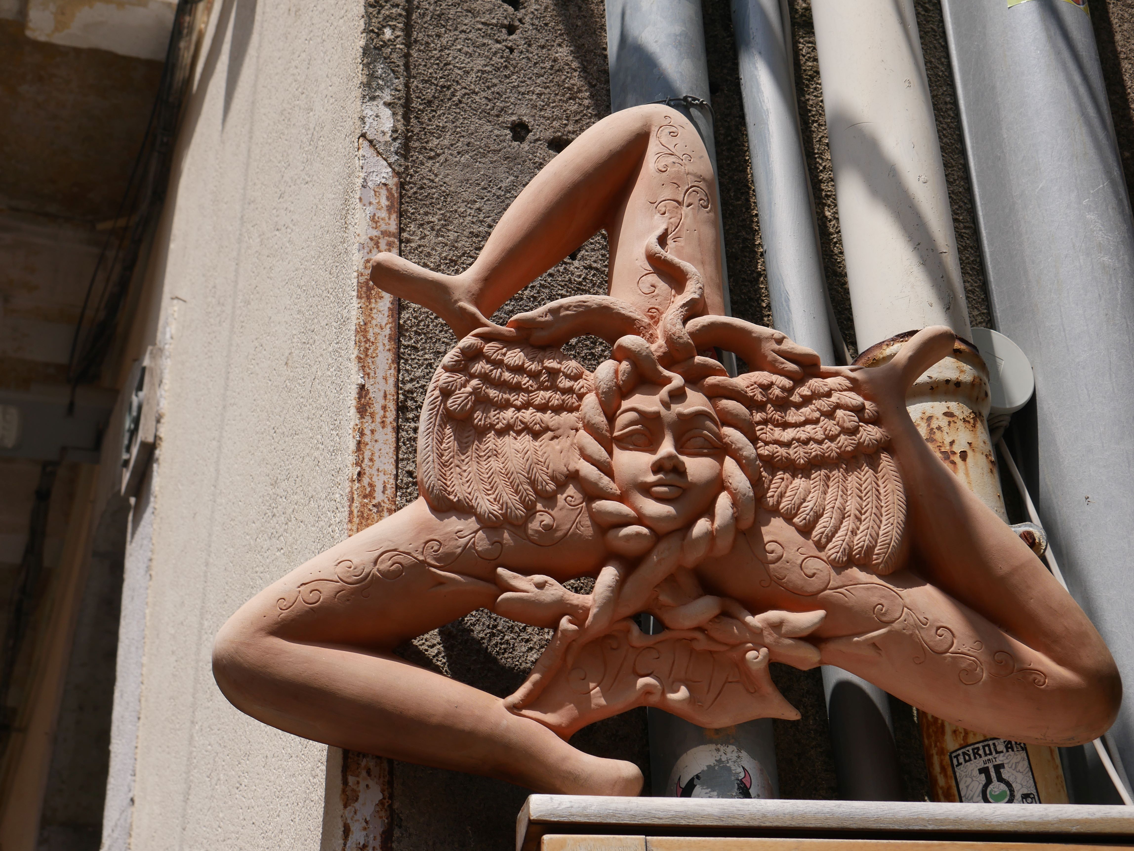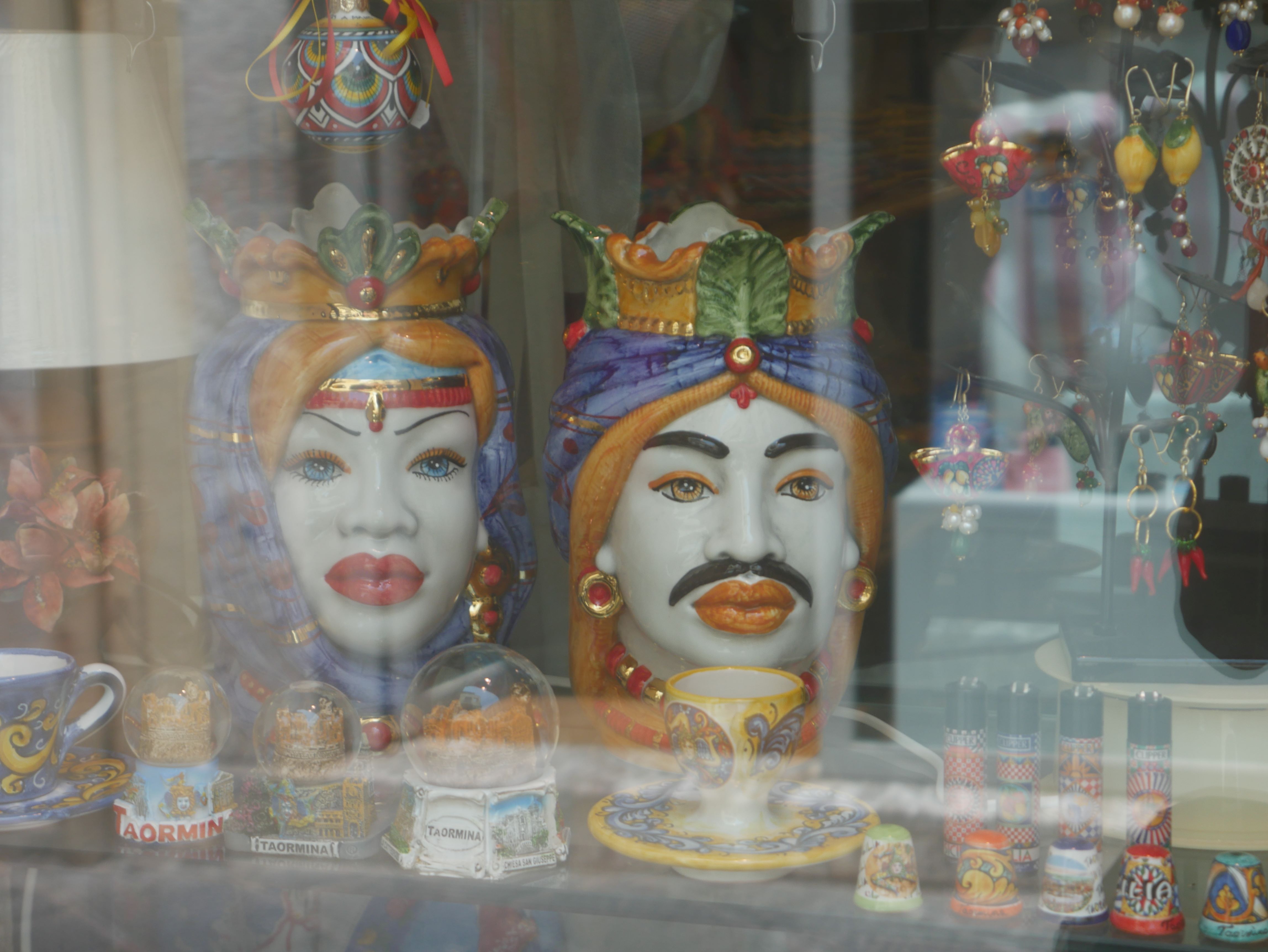 Le lendemain, malgré la chaleur, nous partons pour la journée, nous balader dans les rues de Taormina. Nous découvrons la Trinacria, emblème de la sicile avec son visage de femme avec une paire d’ailes à la place des oreilles, des serpents en guise de cheveux et un triskèle de jambes fléchies autour, que l’on aperçoit à tous les coins de rues, et sur les enseignes de la plupart des commerces. Autre symbole omniprésent dans les vitrines, cours et balcons de la ville, la Testa di Moro (aussi appelée « Grasta »), vase en porcelaine représentant une tête de Maure (souvent accompagne de sa belle), dont la légende sordide veut qu’une jeune sicilienne séduite par un voyageur Maure, lorsqu’elle découvrit qu’il menait une double-vie, lui aurait coupé la tête pour s’en faire un vase et y cultiver du basilic qu’elle arrosait de ses larmes.