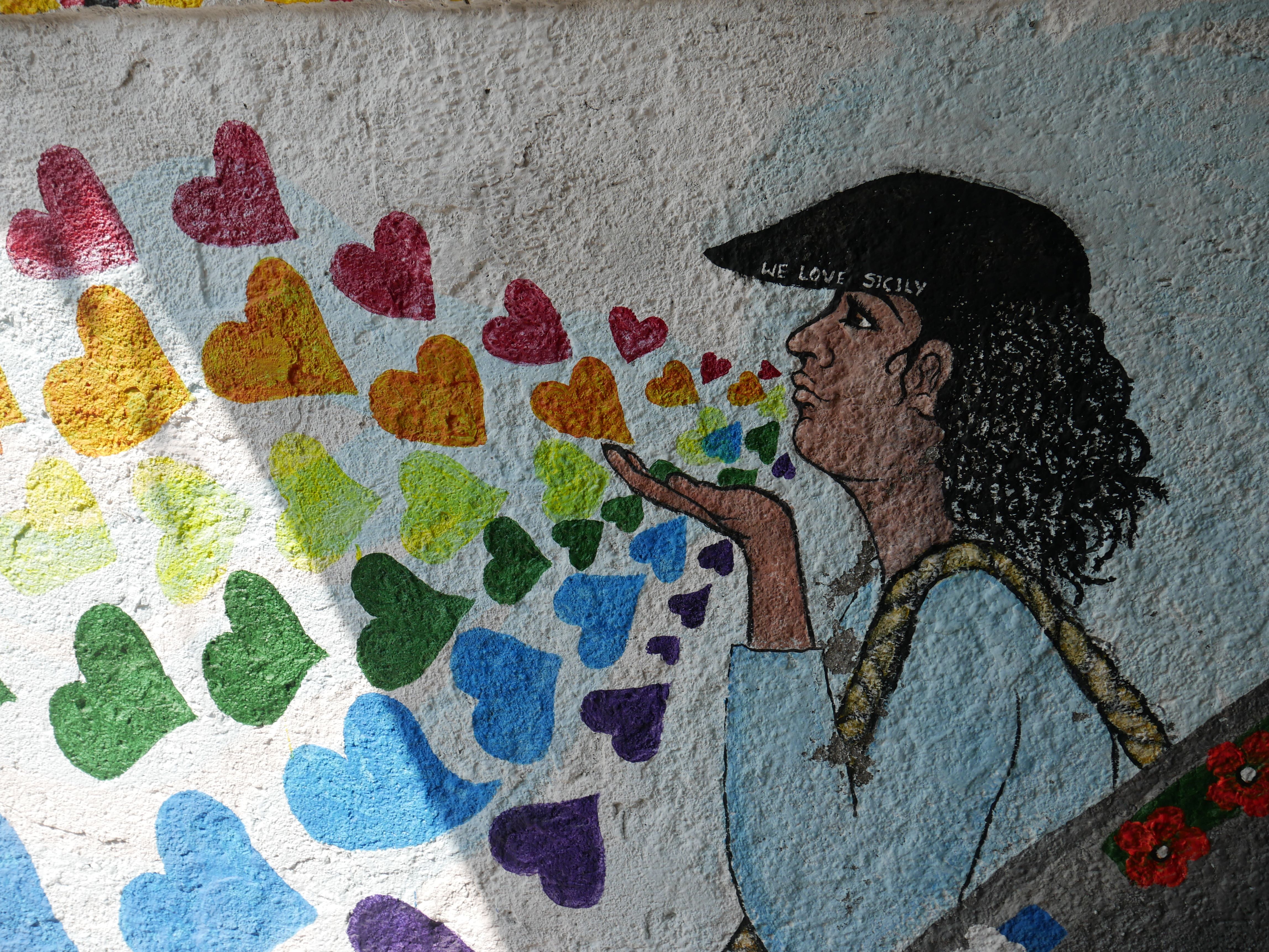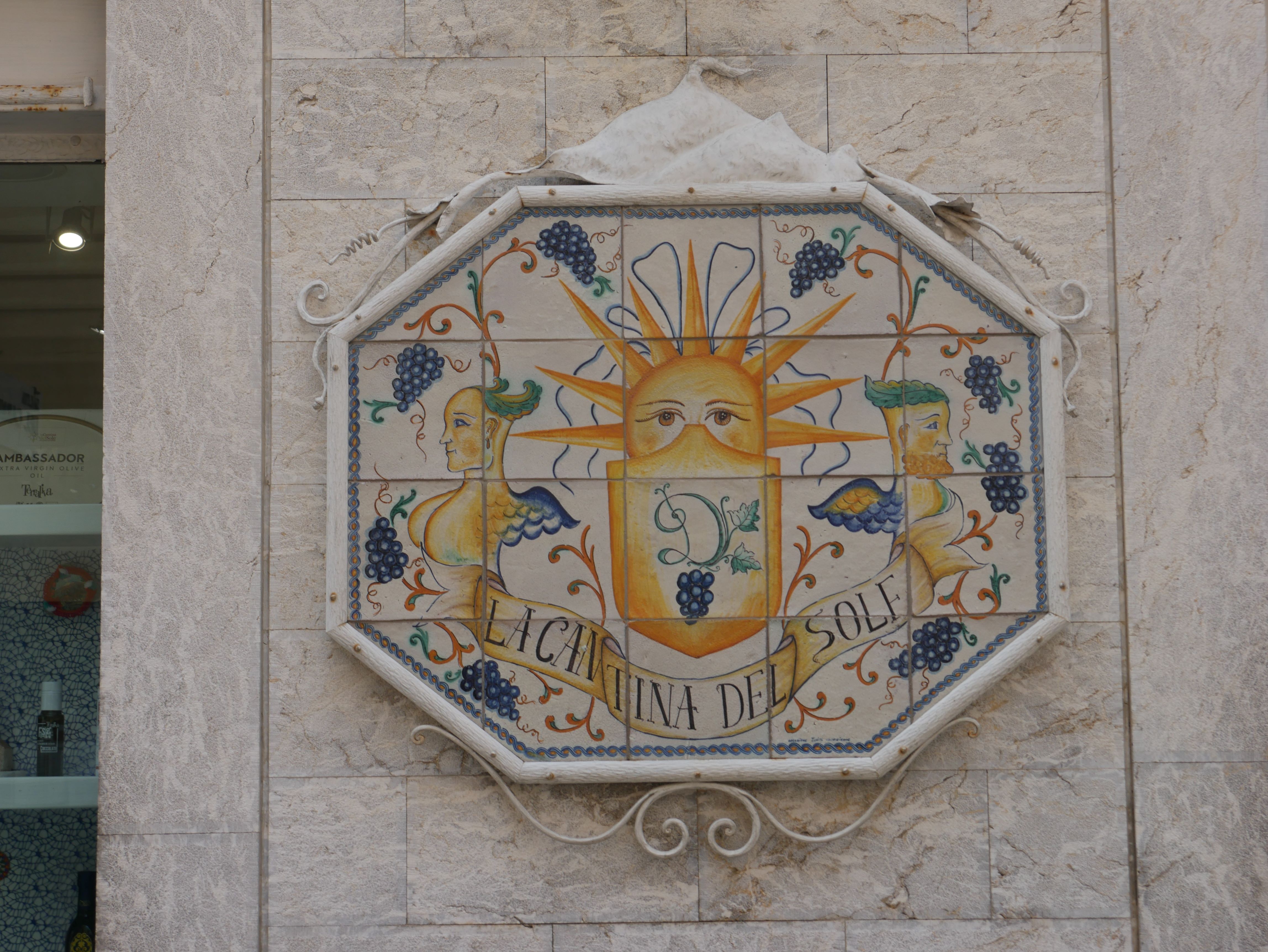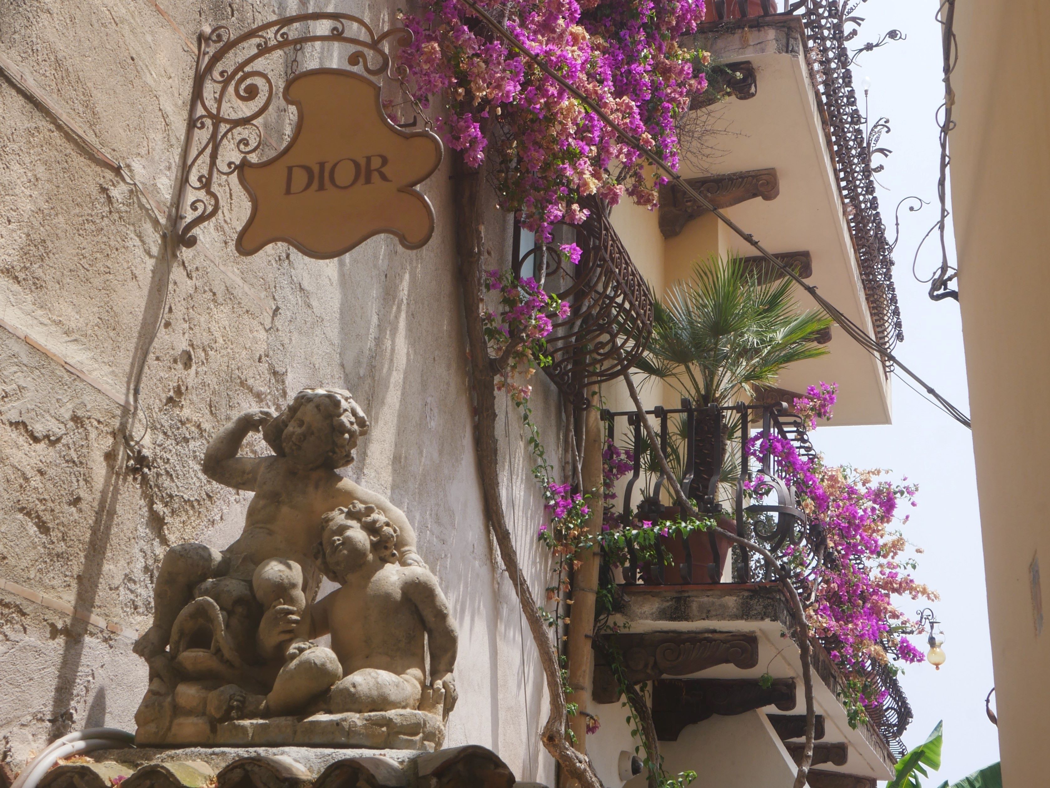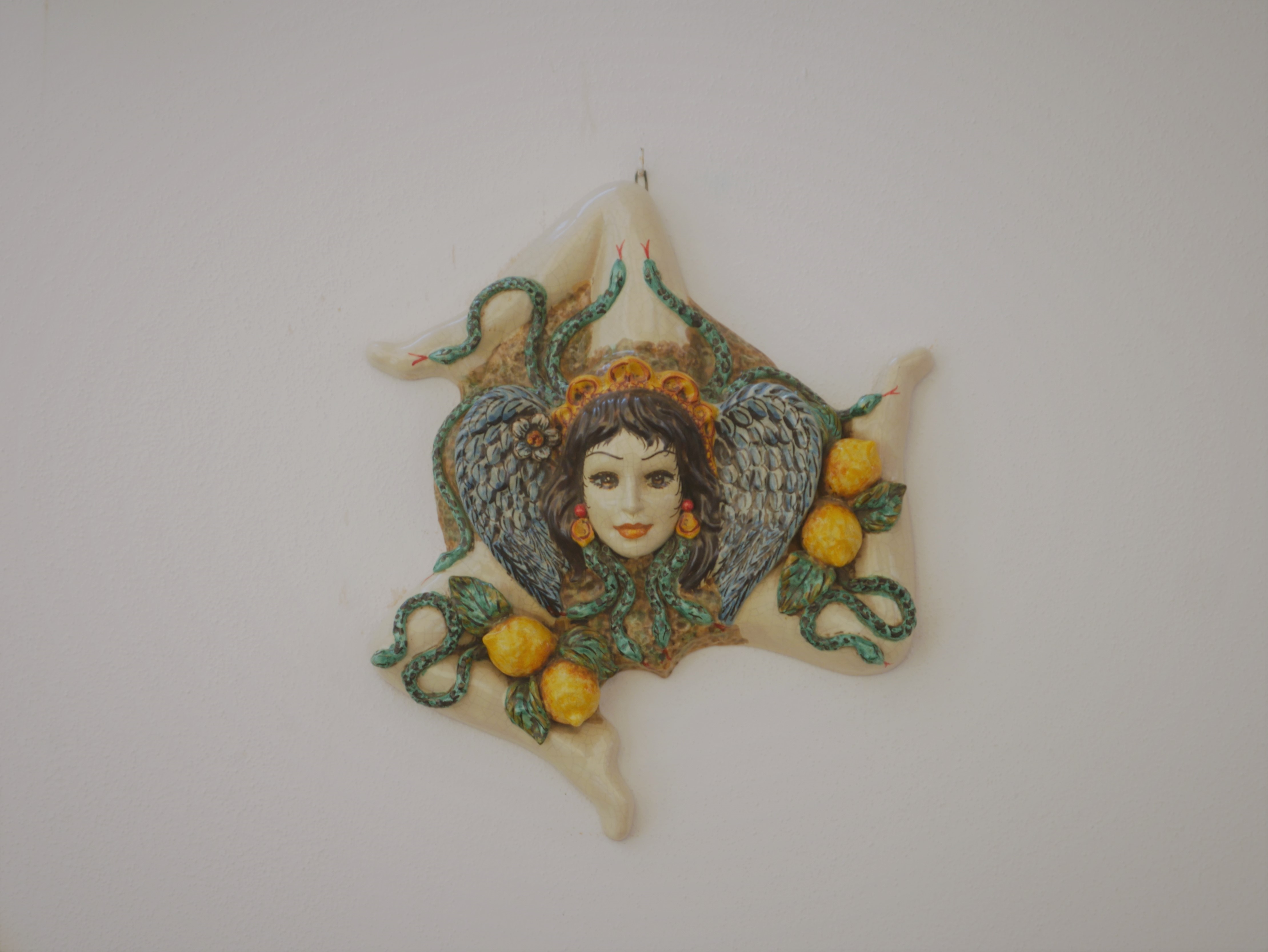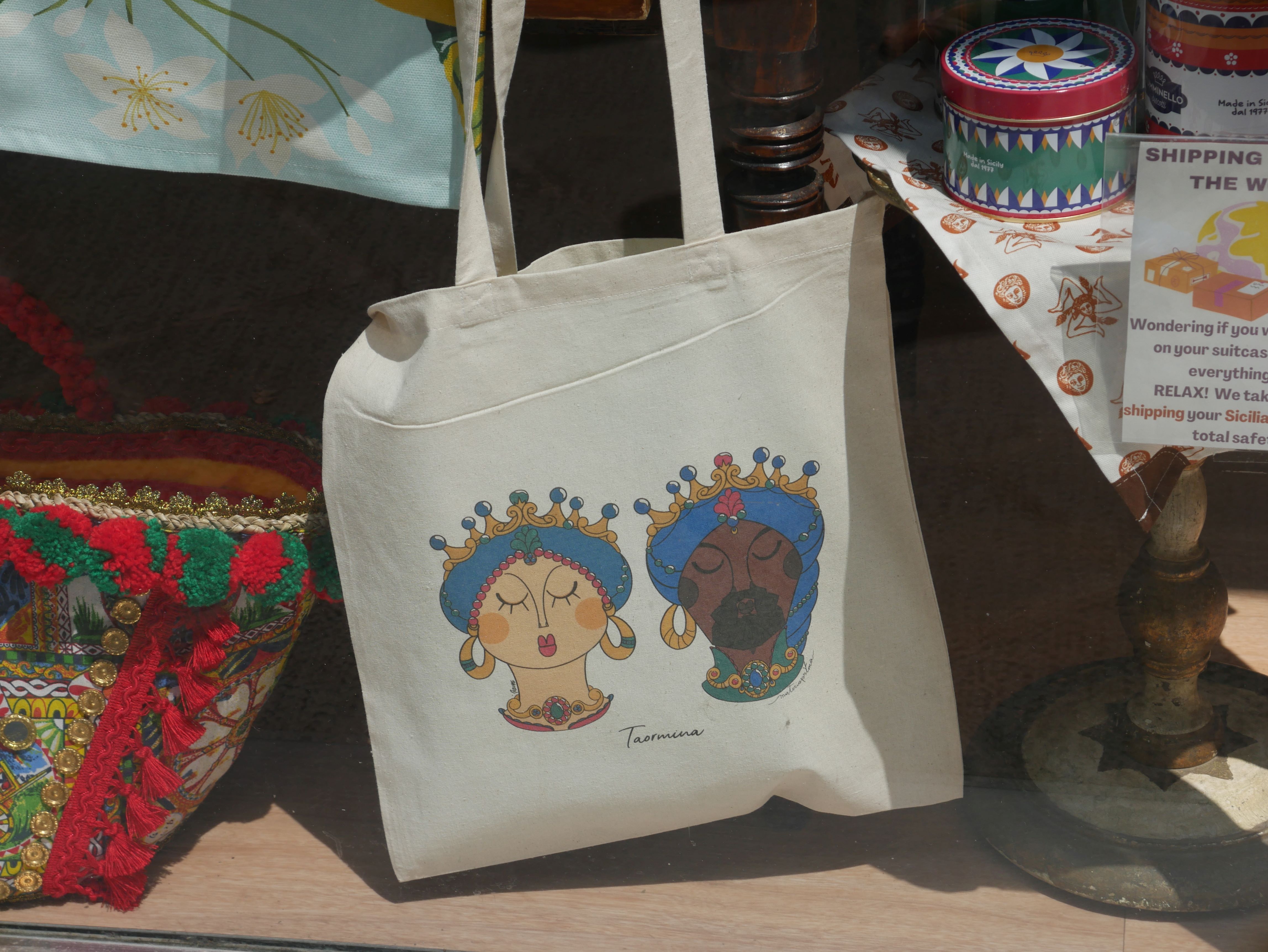 Le lendemain, malgré la chaleur, nous partons pour la journée, nous balader dans les rues de Taormina. Nous découvrons la Trinacria, emblème de la sicile avec son visage de femme avec une paire d’ailes à la place des oreilles, des serpents en guise de cheveux et un triskèle de jambes fléchies autour, que l’on aperçoit à tous les coins de rues, et sur les enseignes de la plupart des commerces. Autre symbole omniprésent dans les vitrines, cours et balcons de la ville, la Testa di Moro (aussi appelée « Grasta »), vase en porcelaine représentant une tête de Maure (souvent accompagne de sa belle), dont la légende sordide veut qu’une jeune sicilienne séduite par un voyageur Maure, lorsqu’elle découvrit qu’il menait une double-vie, lui aurait coupé la tête pour s’en faire un vase et y cultiver du basilic qu’elle arrosait de ses larmes.