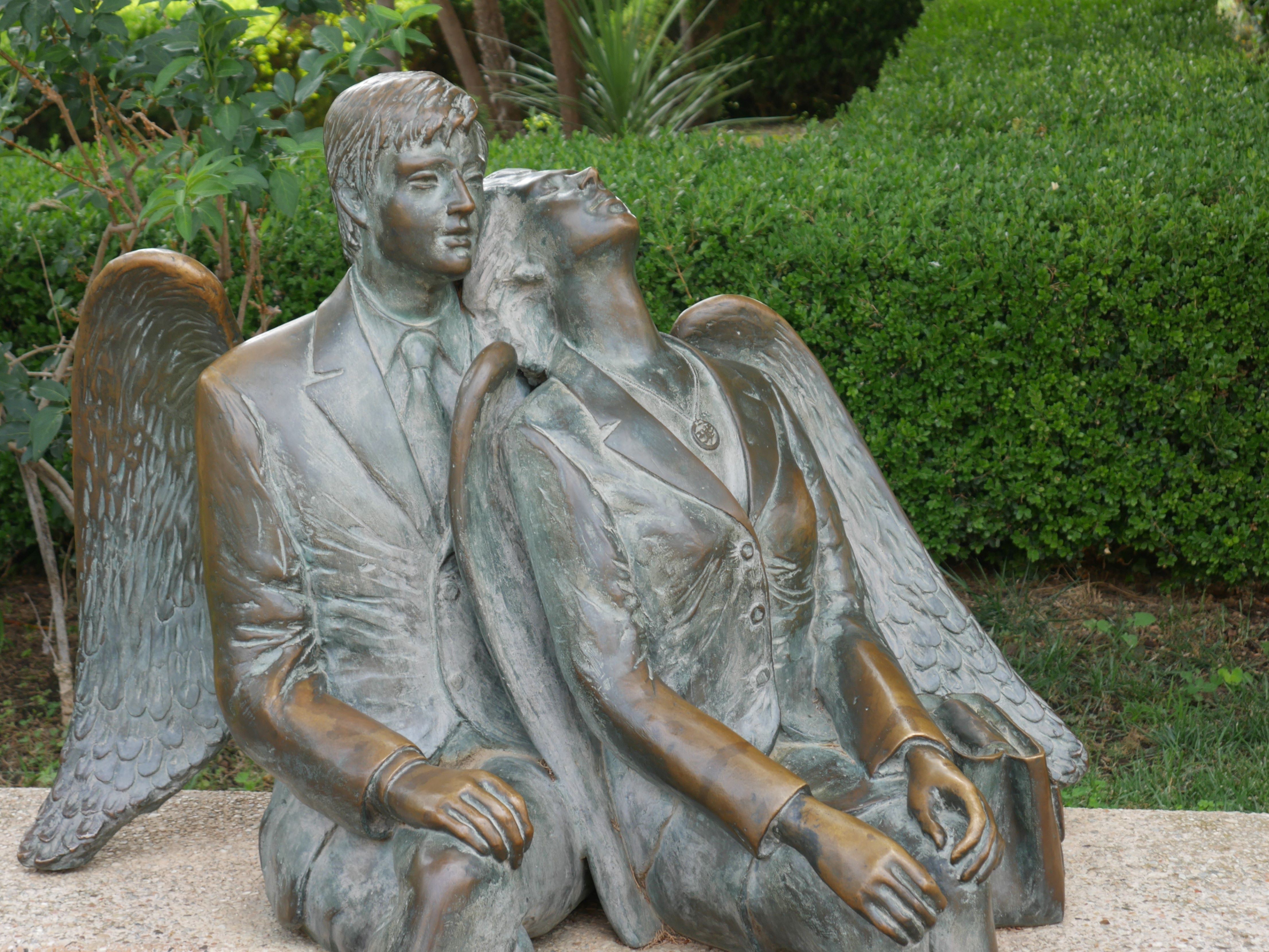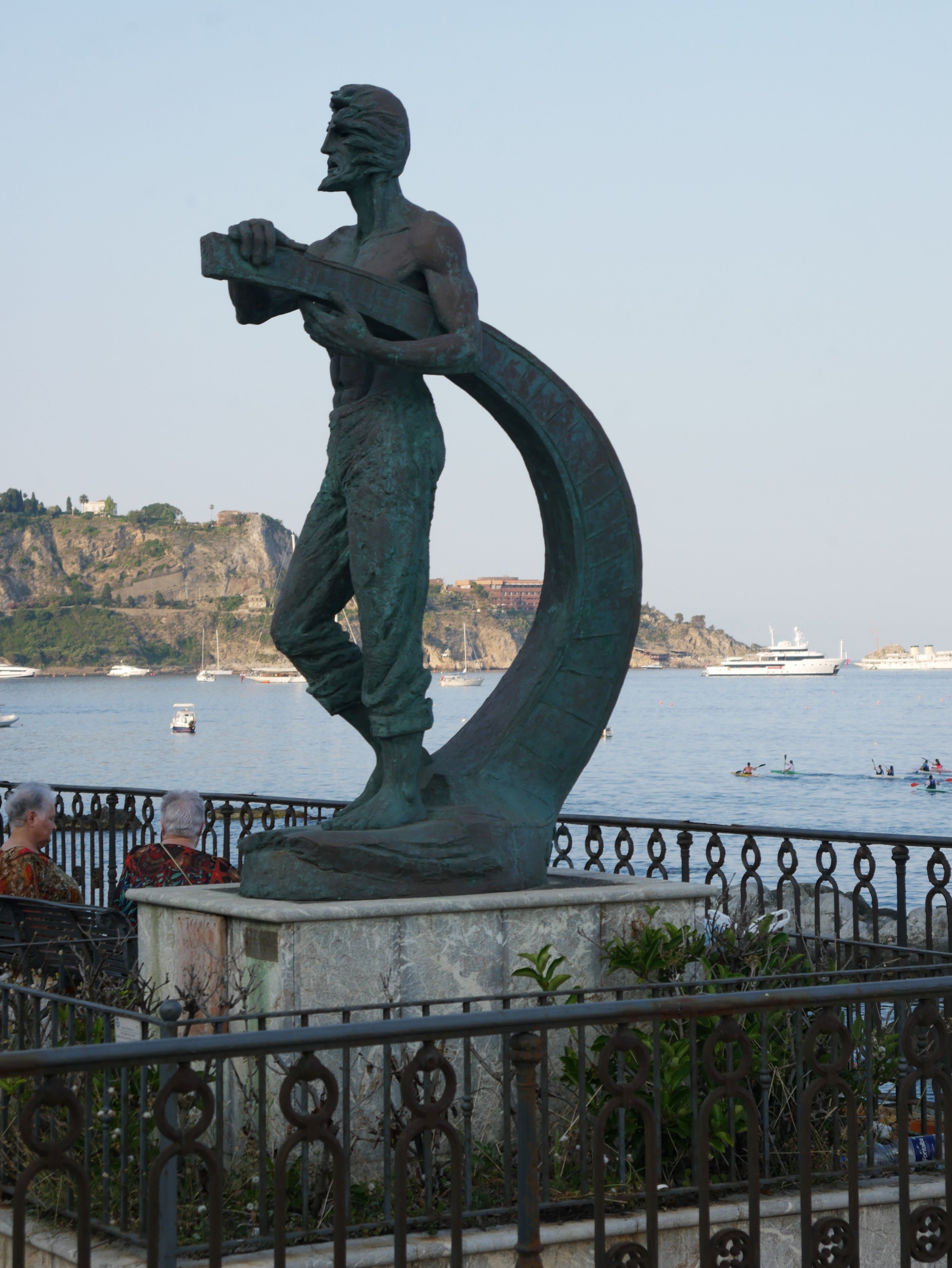 Les touristes sont nombreux et la vue de la place du IX avril ne porte pas jusqu’à l’Etna, caché derrière la brume, cependant la grâce de la ville est à la hauteur de nos attentes. Nous apprécions son ambiance colorée, ses petites ruelles labyrinthiques, la verdure de ses  jardins publiques, où nous trouvons un peu de fraicheur à côté d’un couple d’anges en bronze qui s’étreint sur un banc pour l’éternité, et ses bâtiments historiques, notamment le Duomo, où nous nous recueillons devant l’icône au cadre d’argent incrusté de pierres semi-précieuses, et devant le bas-relief de la Cène dont l’expression de mésentente voire d’accusation des apôtres rend Azur perplexe, et que je ne suis pas en mesure d’expliquer (appelant ma bonne amie Ariane à la rescousse, qui me renvoit au passage de la Bible ou Jésus annonce qu’il va être trahi par l’un deux).