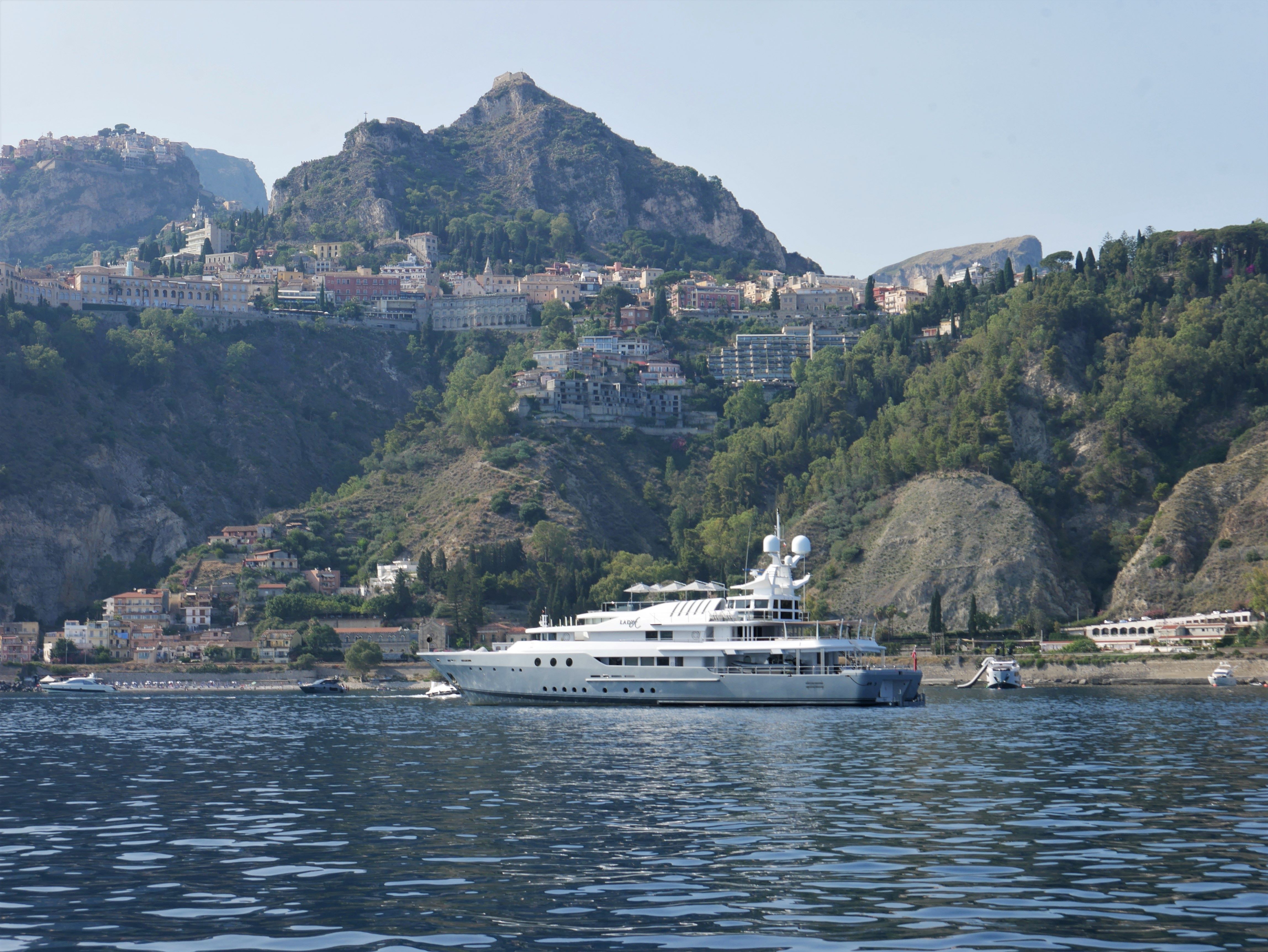 Aborder la baie de Taormina a quelque chose d’étourdissant car la baie est immense et qu’il est difficile, même avec l’aide précieuse de Navily (app collaborative recensant les mouillages de méditerranée avec moultes informations et commentaires de plaisanciers), de savoir où s’ancrer qui soit à la fois autorisé (min. 300m de la plage) et pratique pour débarquer à terre, mais aussi parce qu’on la partage avec un nombre ahurissant de super – voire méga – yachts, à nous faire spéculer qu’il doit se tramer un G8 des malfrats dans le coin.