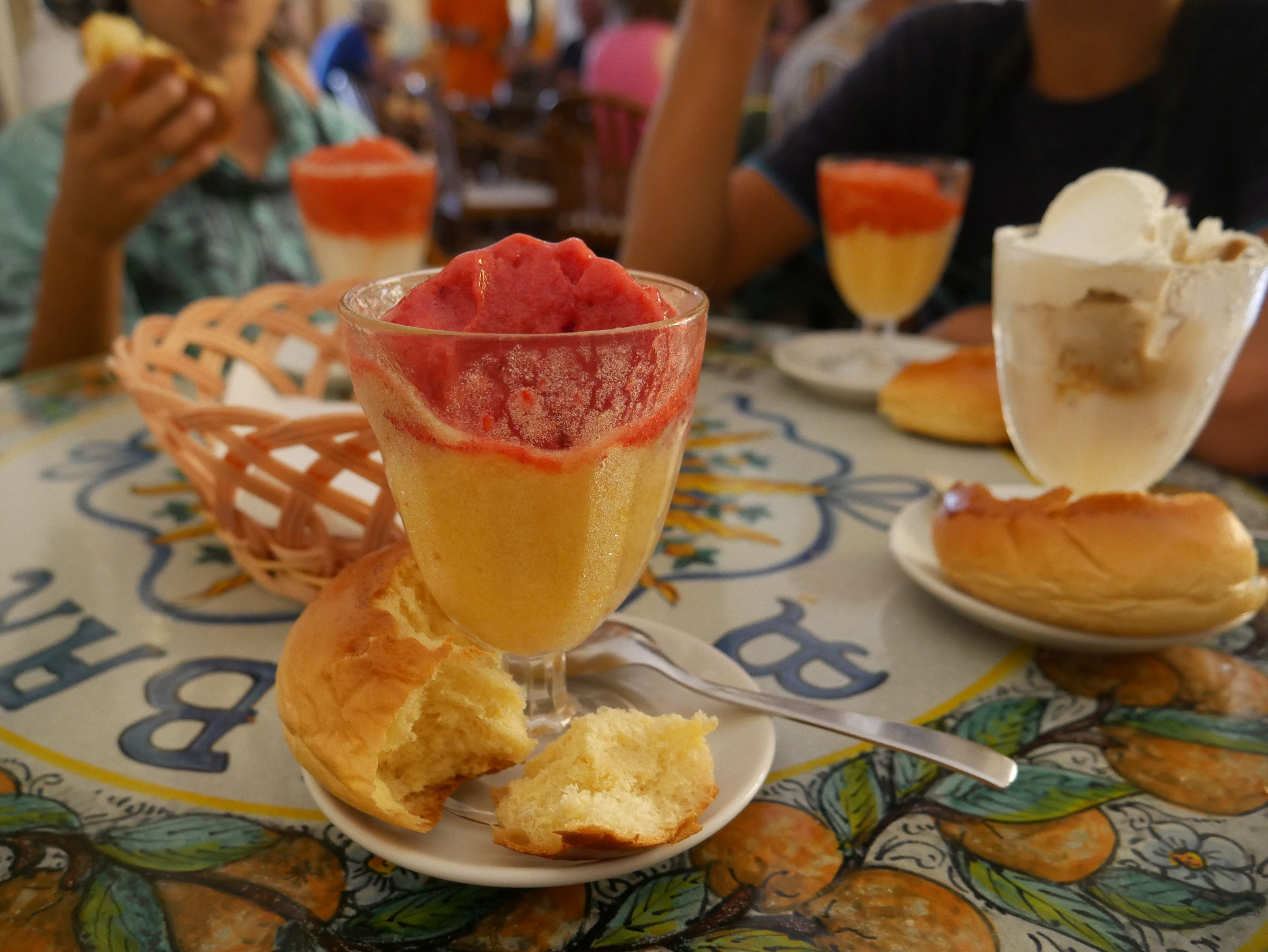 Nous y savourons également les arancini (boulette de riz farcies et frites), ainsi que les combos granite et brioche que les habitants dégustent, parait-il, au petit déjeuner, mais que nous préférons en goûter. En revanche, le gout d’huile rance d’un canelli pas frais nous fait regretter notre passage à la dernière boulangerie tape-à-l’œil à l’entrée du Corso Umberto.