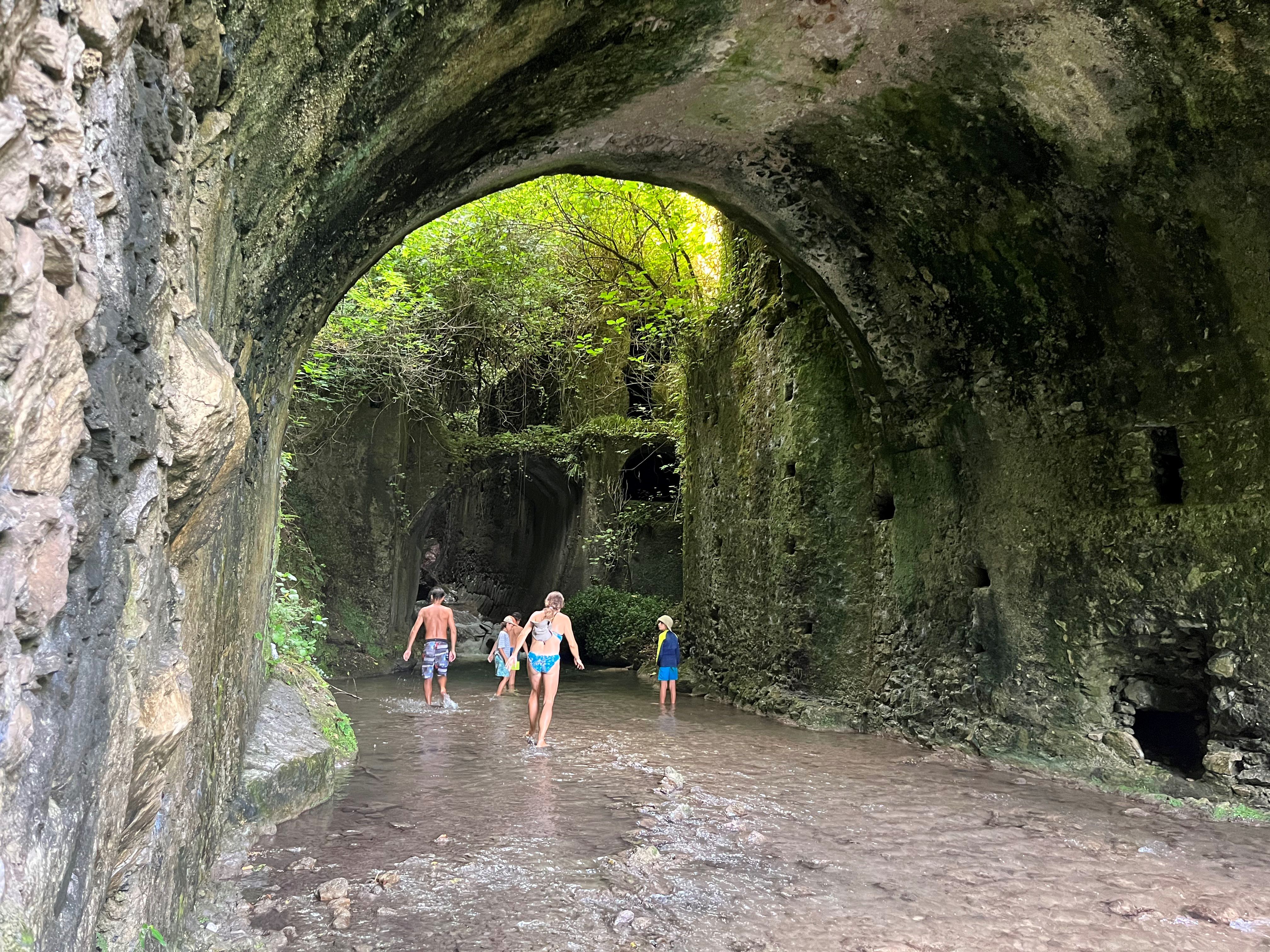 As the first of our tribe stepped on the beach, they were greeted by a visibly annoyed woman guarding it, who barely tolerated we passed through her property to have our picnic in town. Nevertheless, we ignored her and carried on our business of squeezing through the fences to reach “the other side”, where we blended in with the stream of day-trippers at lunchtime. Instagrammers of all nationalities were taking selfies holding with glee their overpriced lemon granite served in whole lemon peel. Quite surprisingly though, the dense crowd vanished as soon as you stepped outside the main streets and ventured further inland towards the via dei Mulini. On our way, kids stopped to exercise on the fitness trail, while naughty parents grabbed a truck load of ripe plums and lemons hanging over from a lush orchard and we walked up to a dead end bathing in a brisk stream flowing under a bridge by the old mills.