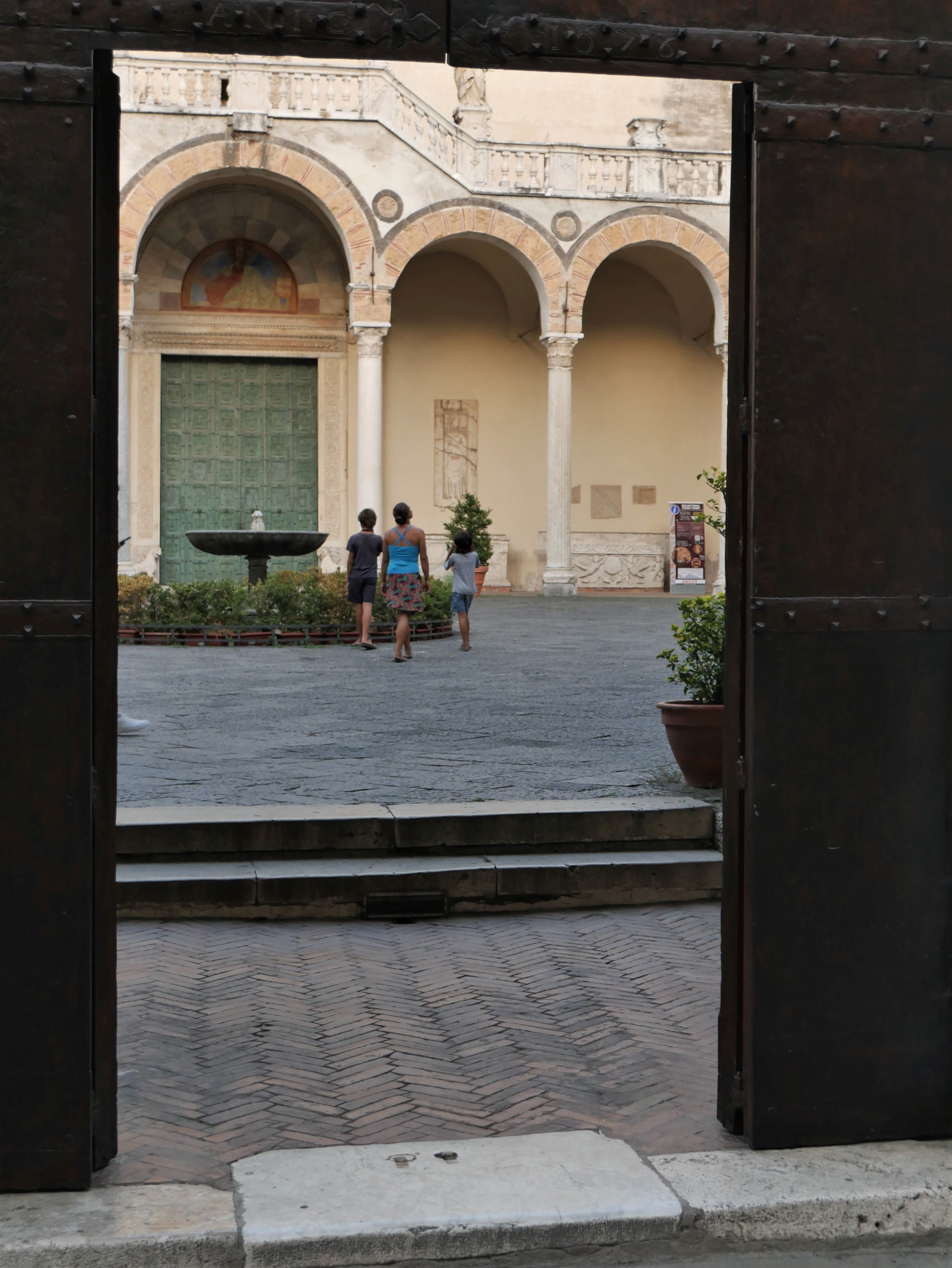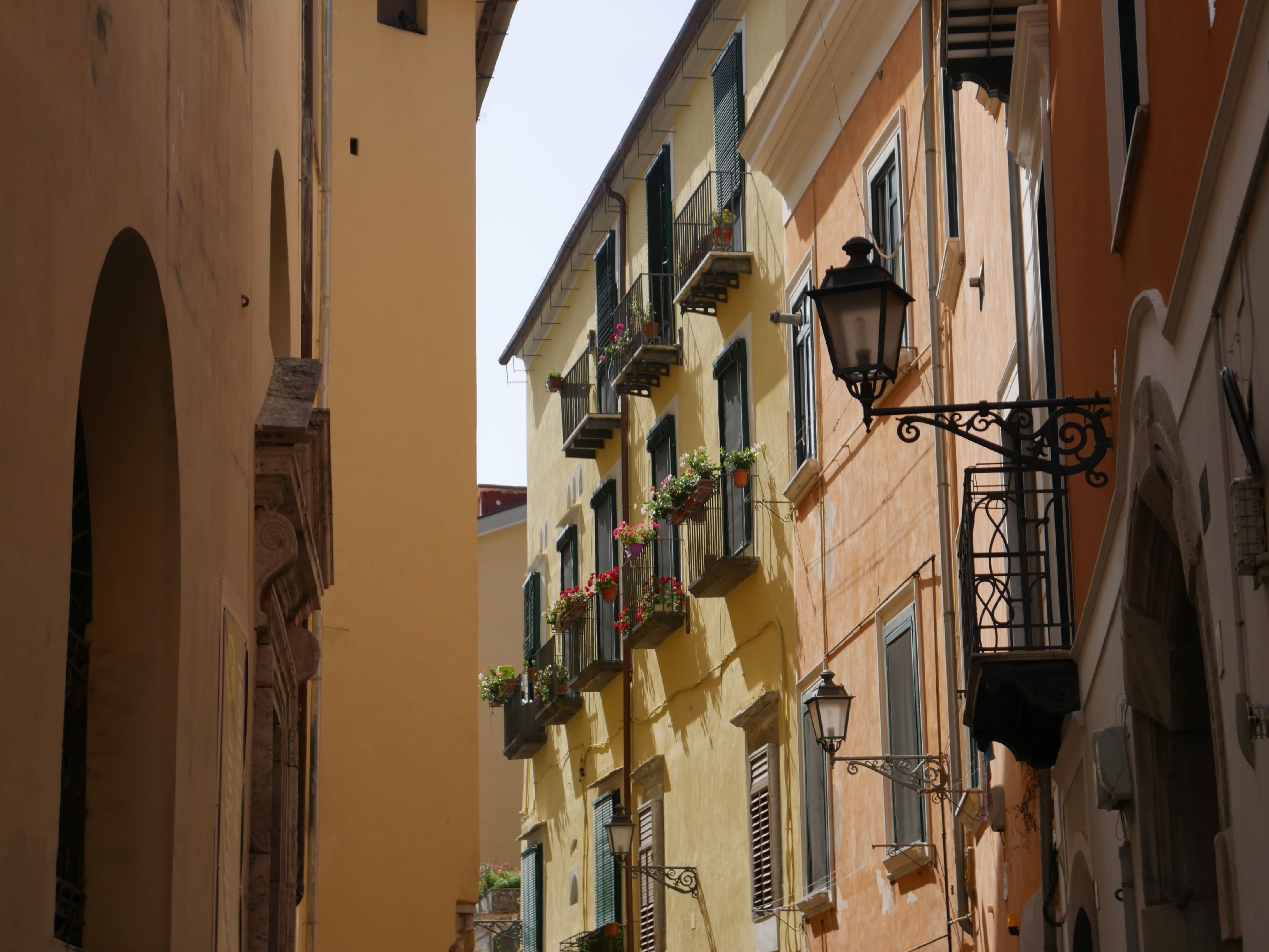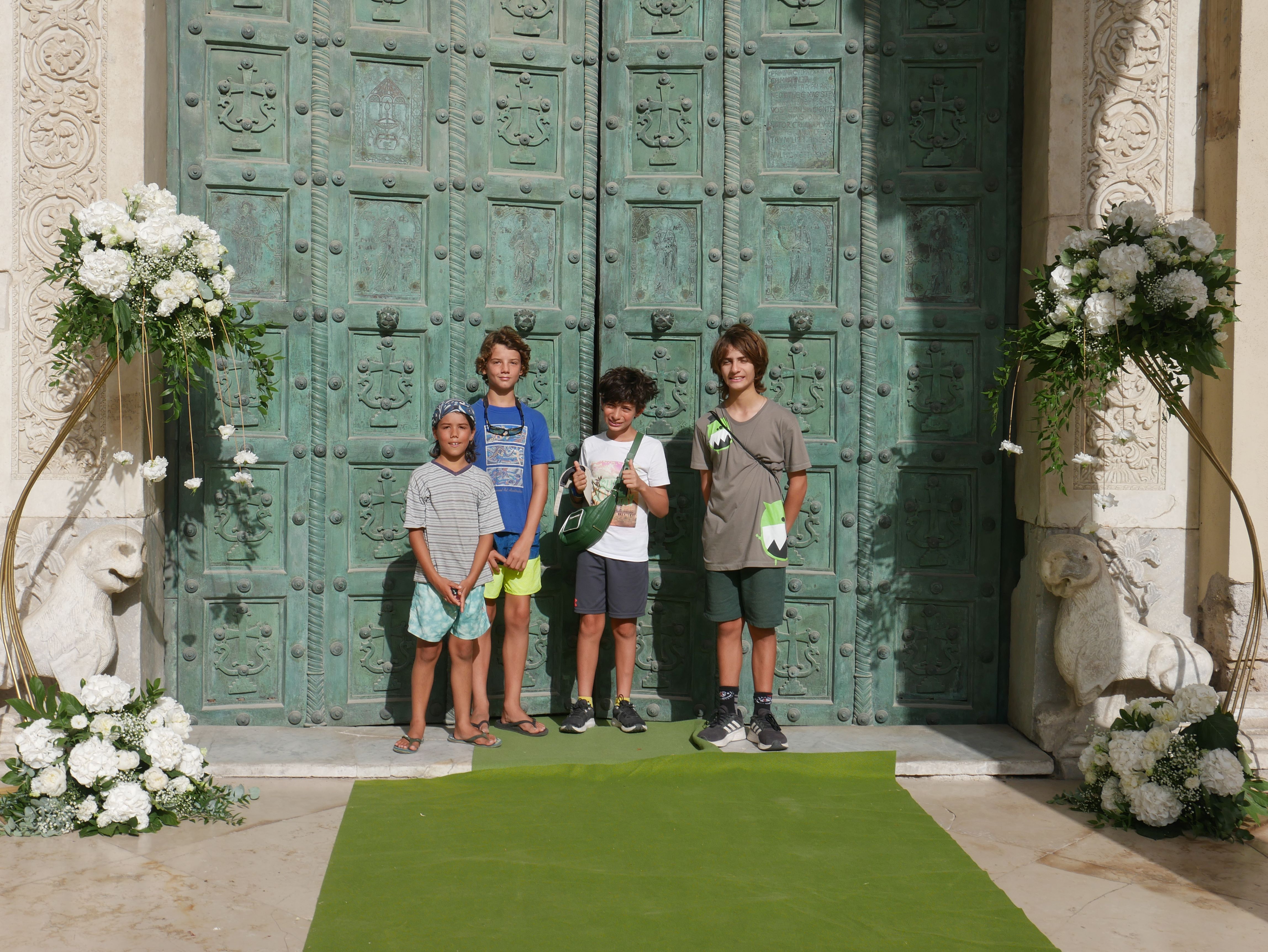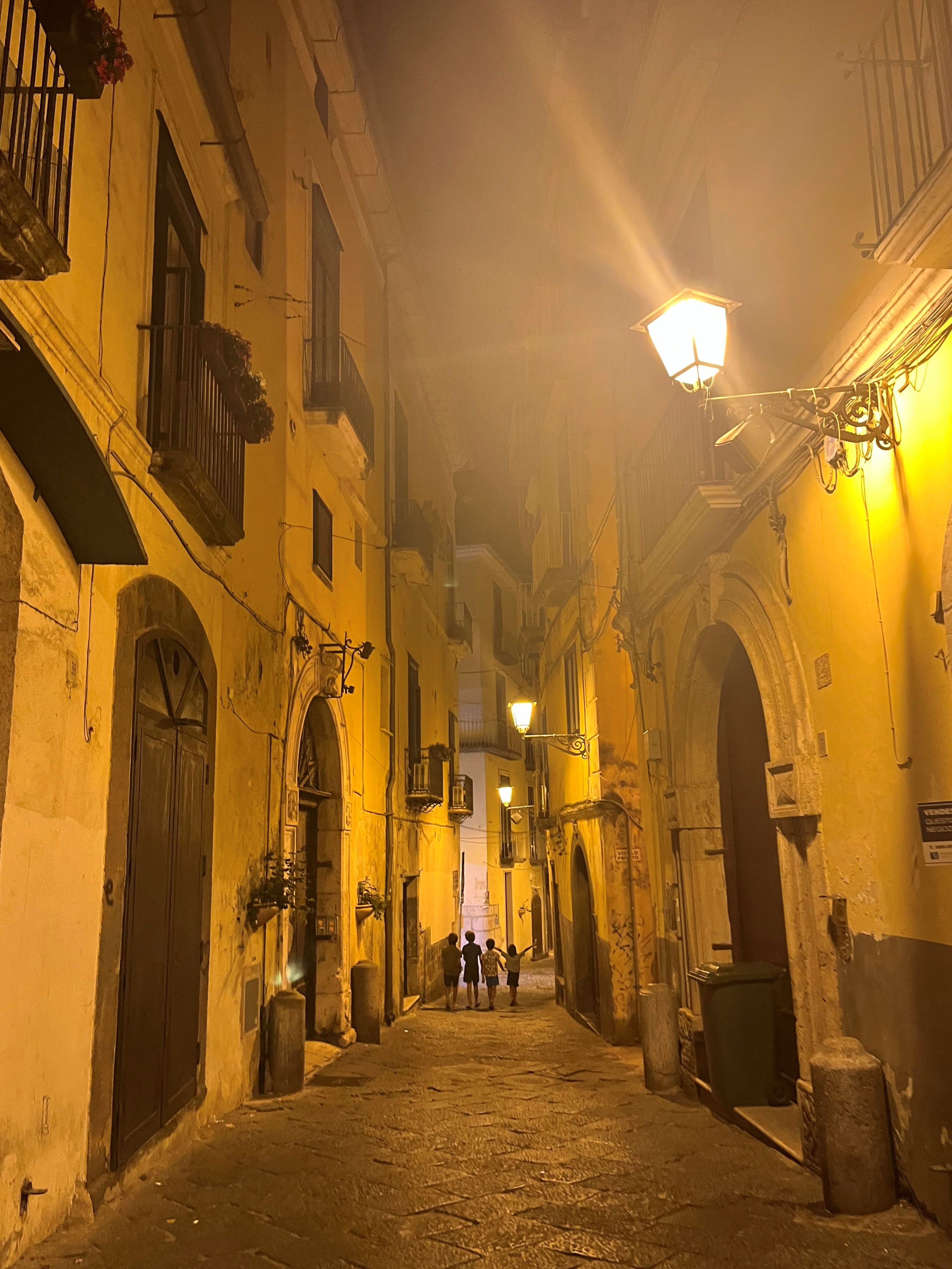In Salerno, which our guests reached by train after landing in Naples, we had our first dinner together at Il Brigante, a hard-to-find family-run hostaria (inn) a British lady met twice in the course of a couple of days had advised us for its character and the quality of its home-cooking, not without mentioning its atypical nature with the bad-temper of the owner, the hand-written menu changing every day at the whim of his wife, the cook, the low-key long communal tables and benches and its parsimonious portions. Quite an experience indeed! We didn’t have to suffer from anyone’s bad mood, but a hard-to-decipher menu, the smell of the waiters’ cigarettes coming from outside, and a stuffy atmosphere that made us appreciate even more the fresh open air that had cooled down after sunset. We wondered the cobble-stoned streets by night, preceded by our boys band leading the way to the traditional gelato and brioche we indulged for dessert before retreating to the boat, in two dinghy loads.