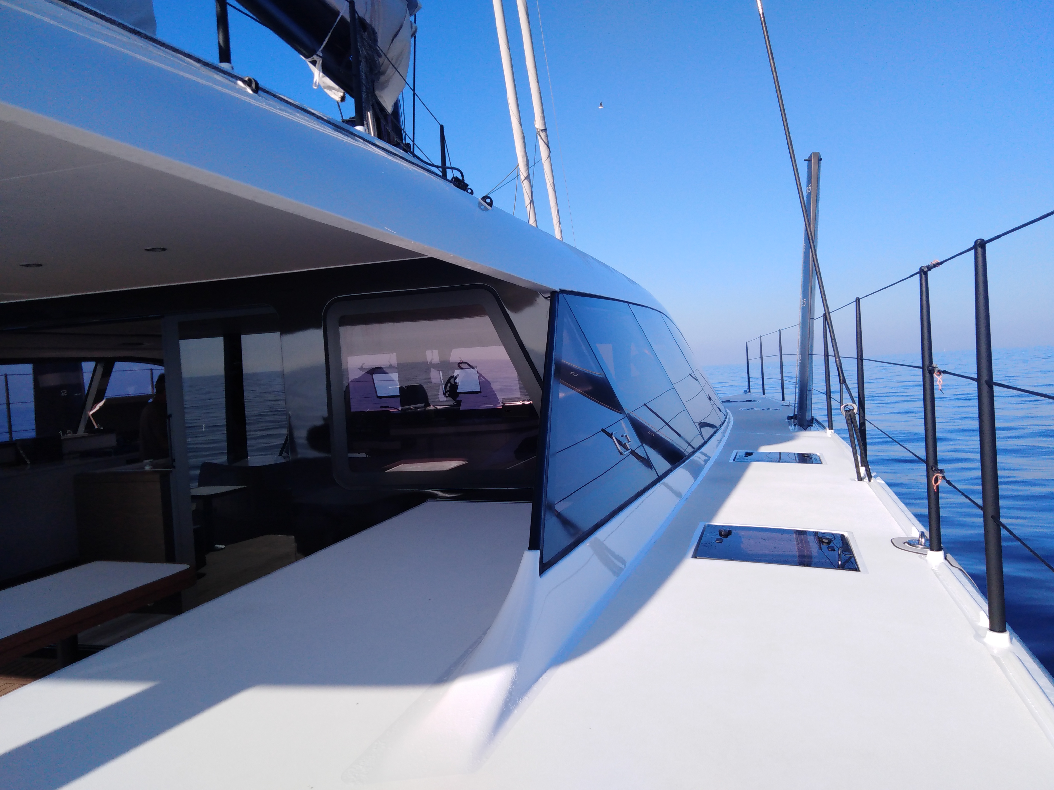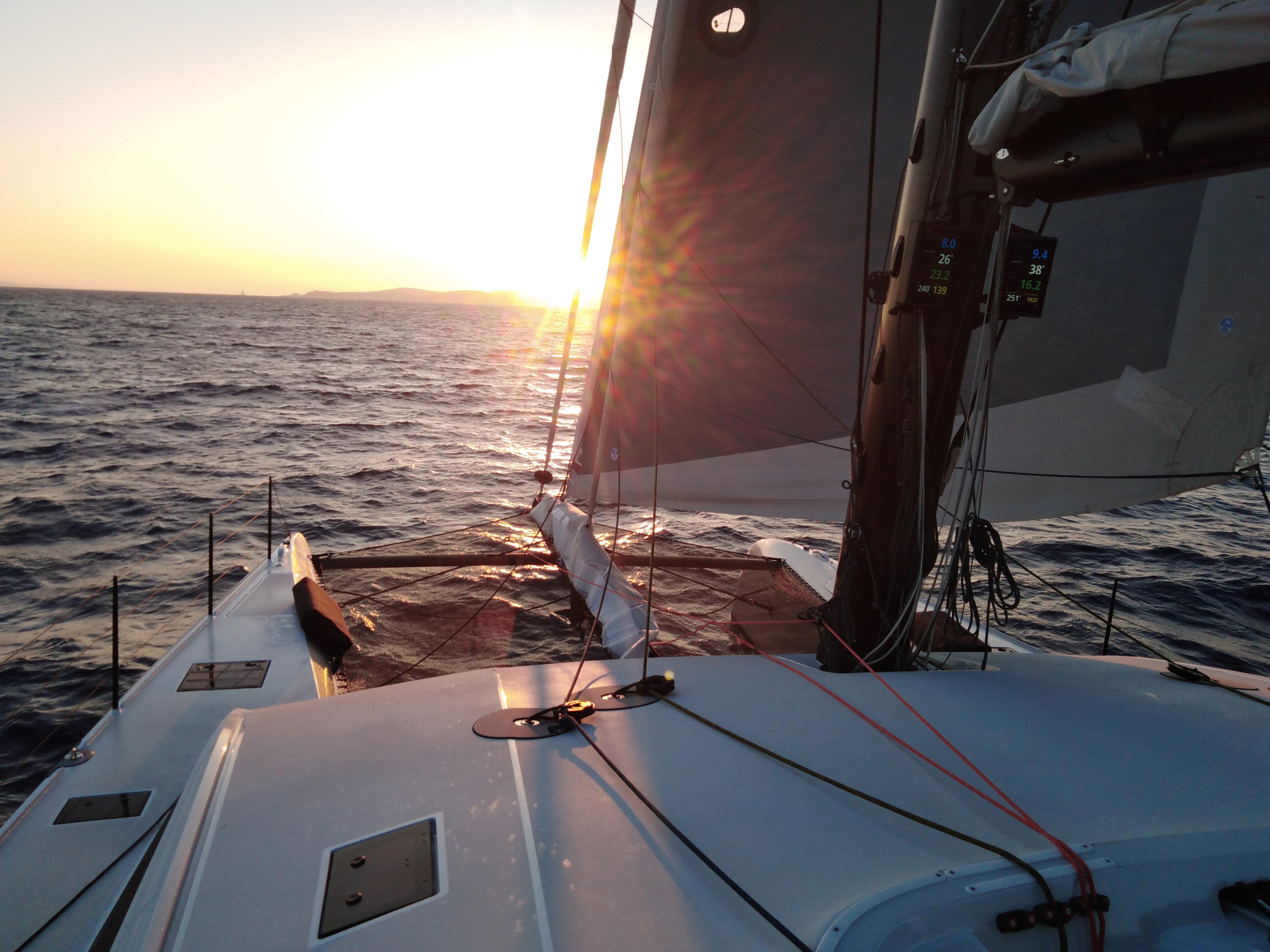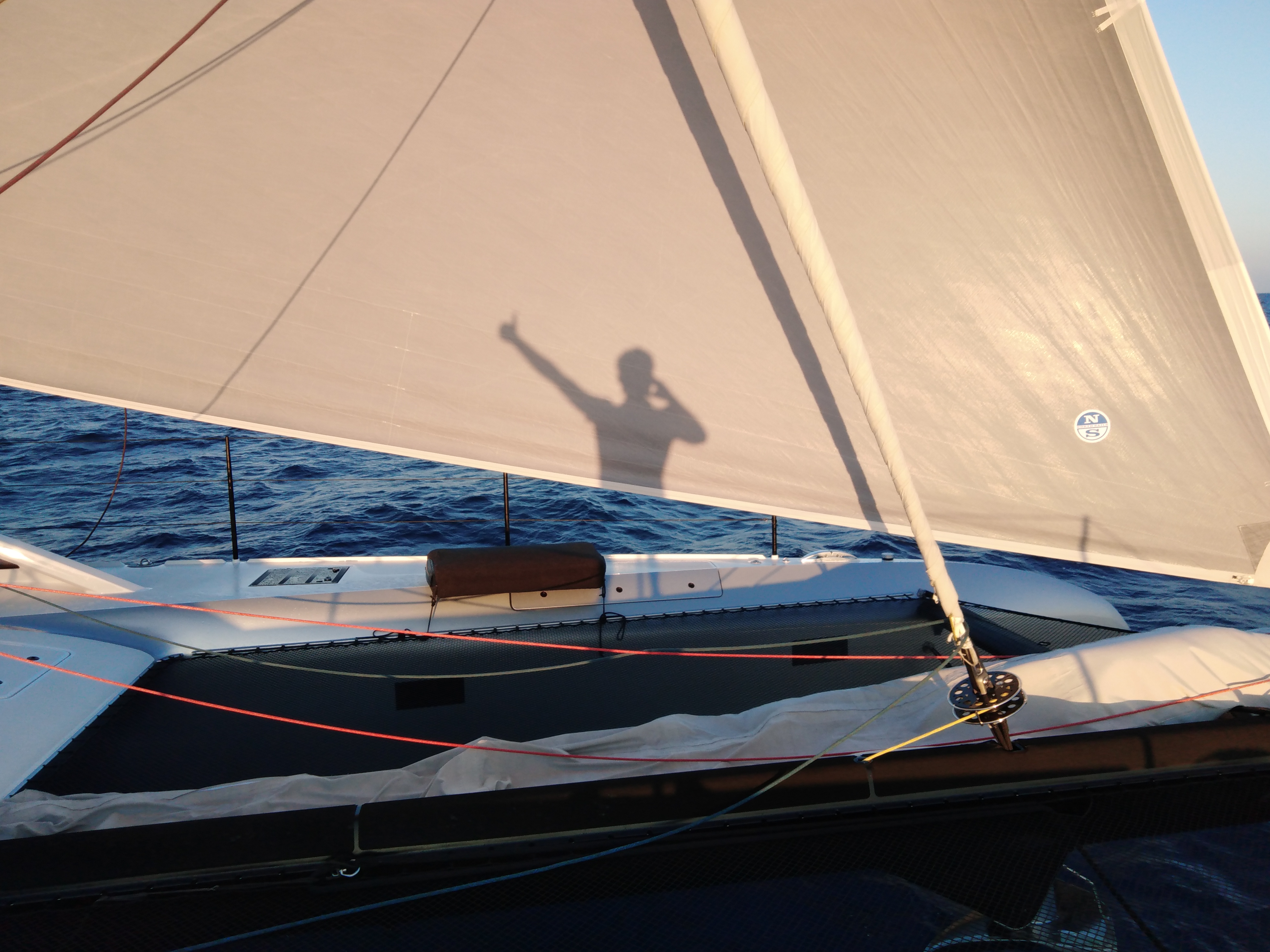 Après quelques “pauses” nous permettant de “prendre du temps pour nous” loin d’Obélix, une fois chez l’oncle de Salomé, une fois à Arles, je dois avouer que j’ai sauté le pas et que j’ai trompé notre compagnon de voyage, j’ai eu une aventure avec un autre bateau… En fait, je suis toujours avec elle au moment où j’écris ces lignes. Wonderful, c’est son nom, est l’une des bêtes les plus sexy qui écument nos océans. Cat Woman, il n’y a pas d’erreur, son ronronnement n’est pas d’une nonchalance apaisante, mais plutôt un grognement retenu, prêt à éclater dans un rugissement débridé, comme une Ferrari dévorant la piste. Car c’est bien ce qu’elle est, une Ferrari des mers, même si nous n’avons pas l’occasion d’en faire l’expérience sur ce convoyage de St Tropez à la Grande Motte, manque de vent oblige. Pourtant, hier, nous faisions 10 nœuds au près par 10 nœuds de vent, et elle accélérait avec agilité après chaque virement de bord, à chaque risée, à chaque inflexion de la barre. Elle est grande aussi, 72′, 32,6m du haut du mât, jusqu’à 3,8m en bas de ses dérives, les mensurations d’un top-modèle. Tout est “top” à bord, et le mélange de top modèle, de champion olympique, de voiture de course transformée en appartement de luxe est peut-être un peu trop pour moi. Ce soir, je vais retrouver le confort et la chaleur de notre “grotte” au fond du ventre rond d’Obélix. L’environnement familier, fraîchement repeint par Salomé, habité par tous les souvenirs, et les heures d’amour pour prendre soin de lui, et les soins qu’Obélix a pris de nous aussi. C’est peut-être ça le véritable amour : des souvenirs partagés et de l’attentions réciproque, avec des rêves à partager aussi !