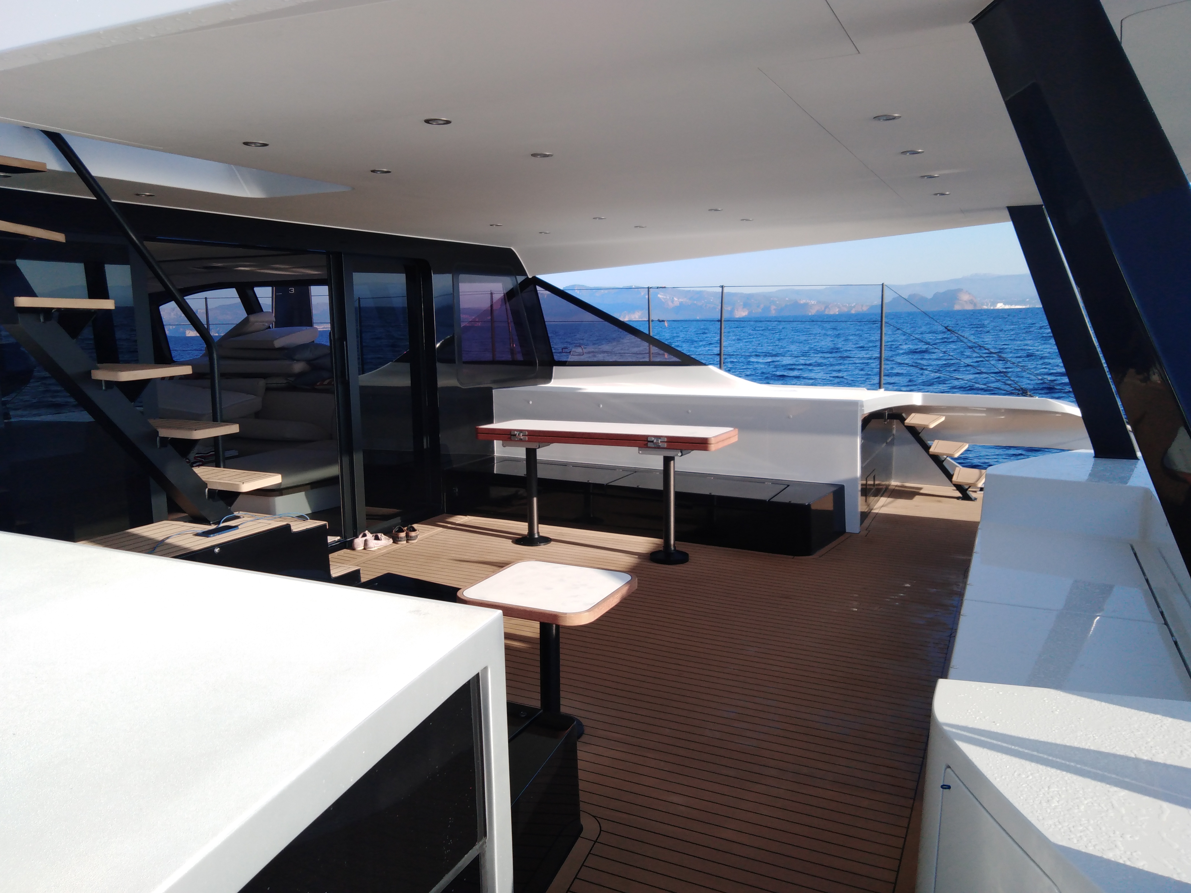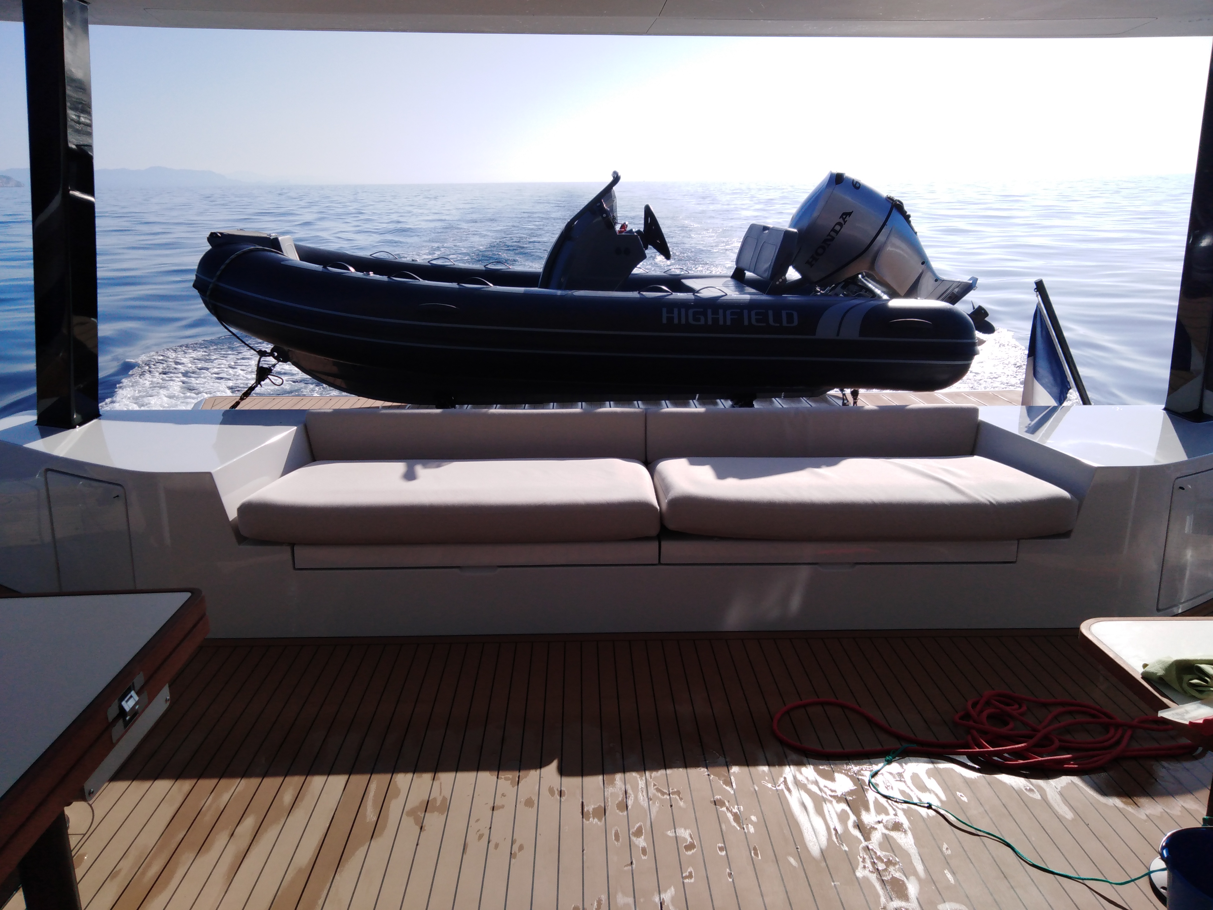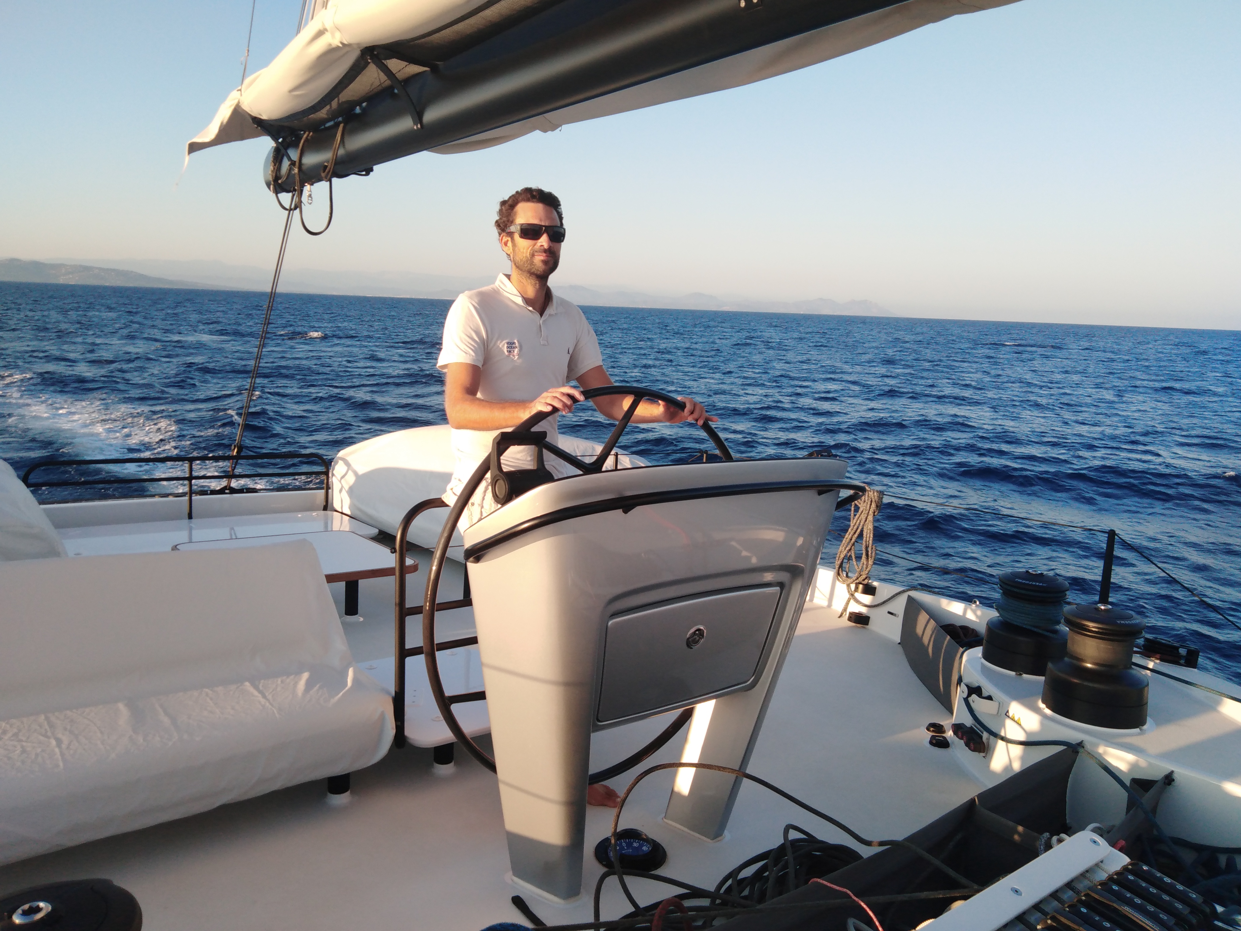 Après quelques “pauses” nous permettant de “prendre du temps pour nous” loin d’Obélix, une fois chez l’oncle de Salomé, une fois à Arles, je dois avouer que j’ai sauté le pas et que j’ai trompé notre compagnon de voyage, j’ai eu une aventure avec un autre bateau… En fait, je suis toujours avec elle au moment où j’écris ces lignes. Wonderful, c’est son nom, est l’une des bêtes les plus sexy qui écument nos océans. Cat Woman, il n’y a pas d’erreur, son ronronnement n’est pas d’une nonchalance apaisante, mais plutôt un grognement retenu, prêt à éclater dans un rugissement débridé, comme une Ferrari dévorant la piste. Car c’est bien ce qu’elle est, une Ferrari des mers, même si nous n’avons pas l’occasion d’en faire l’expérience sur ce convoyage de St Tropez à la Grande Motte, manque de vent oblige. Pourtant, hier, nous faisions 10 nœuds au près par 10 nœuds de vent, et elle accélérait avec agilité après chaque virement de bord, à chaque risée, à chaque inflexion de la barre. Elle est grande aussi, 72′, 32,6m du haut du mât, jusqu’à 3,8m en bas de ses dérives, les mensurations d’un top-modèle. Tout est “top” à bord, et le mélange de top modèle, de champion olympique, de voiture de course transformée en appartement de luxe est peut-être un peu trop pour moi. Ce soir, je vais retrouver le confort et la chaleur de notre “grotte” au fond du ventre rond d’Obélix. L’environnement familier, fraîchement repeint par Salomé, habité par tous les souvenirs, et les heures d’amour pour prendre soin de lui, et les soins qu’Obélix a pris de nous aussi. C’est peut-être ça le véritable amour : des souvenirs partagés et de l’attentions réciproque, avec des rêves à partager aussi !