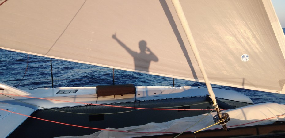 Après quelques “pauses” nous permettant de “prendre du temps pour nous” loin d’Obélix, une fois chez l’oncle de Salomé, une fois à Arles, je dois avouer que j’ai sauté le pas et que j’ai trompé notre compagnon de voyage, j’ai eu une aventure avec un autre bateau… En fait, je suis toujours avec elle au moment où j’écris ces lignes. Wonderful, c’est son nom, est l’une des bêtes les plus sexy qui écument nos océans. Cat Woman, il n’y a pas d’erreur, son ronronnement n’est pas d’une nonchalance apaisante, mais plutôt un grognement retenu, prêt à éclater dans un rugissement débridé, comme une Ferrari dévorant la piste. Car c’est bien ce qu’elle est, une Ferrari des mers, même si nous n’avons pas l’occasion d’en faire l’expérience sur ce convoyage de St Tropez à la Grande Motte, manque de vent oblige. Pourtant, hier, nous faisions 10 nœuds au près par 10 nœuds de vent, et elle accélérait avec agilité après chaque virement de bord, à chaque risée, à chaque inflexion de la barre. Elle est grande aussi, 72′, 32,6m du haut du mât, jusqu’à 3,8m en bas de ses dérives, les mensurations d’un top-modèle. Tout est “top” à bord, et le mélange de top modèle, de champion olympique, de voiture de course transformée en appartement de luxe est peut-être un peu trop pour moi. Ce soir, je vais retrouver le confort et la chaleur de notre “grotte” au fond du ventre rond d’Obélix. L’environnement familier, fraîchement repeint par Salomé, habité par tous les souvenirs, et les heures d’amour pour prendre soin de lui, et les soins qu’Obélix a pris de nous aussi. C’est peut-être ça le véritable amour : des souvenirs partagés et de l’attentions réciproque, avec des rêves à partager aussi !