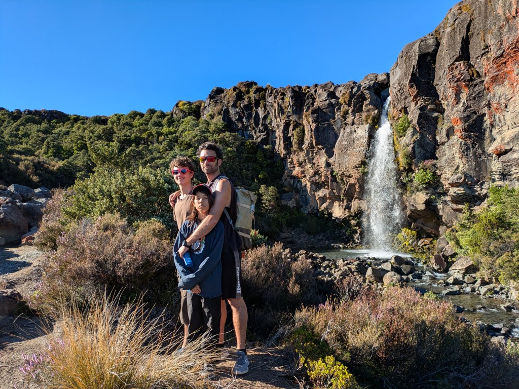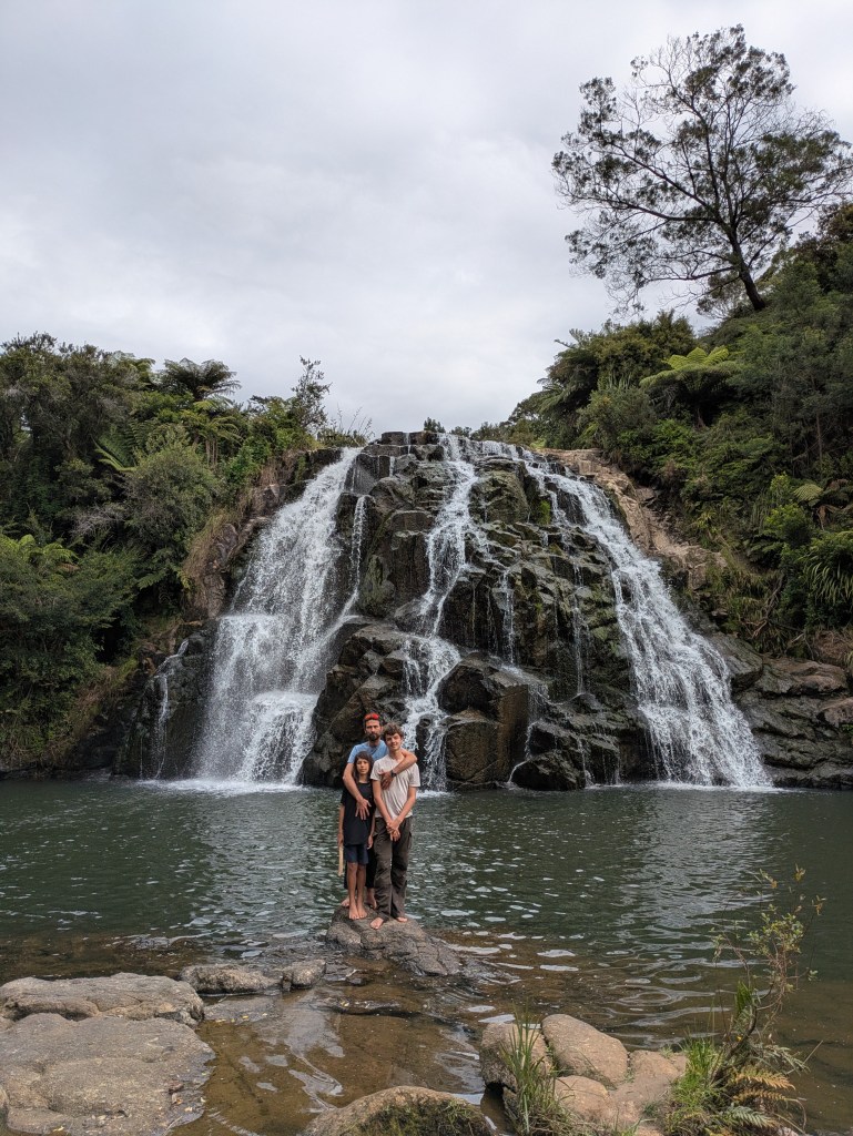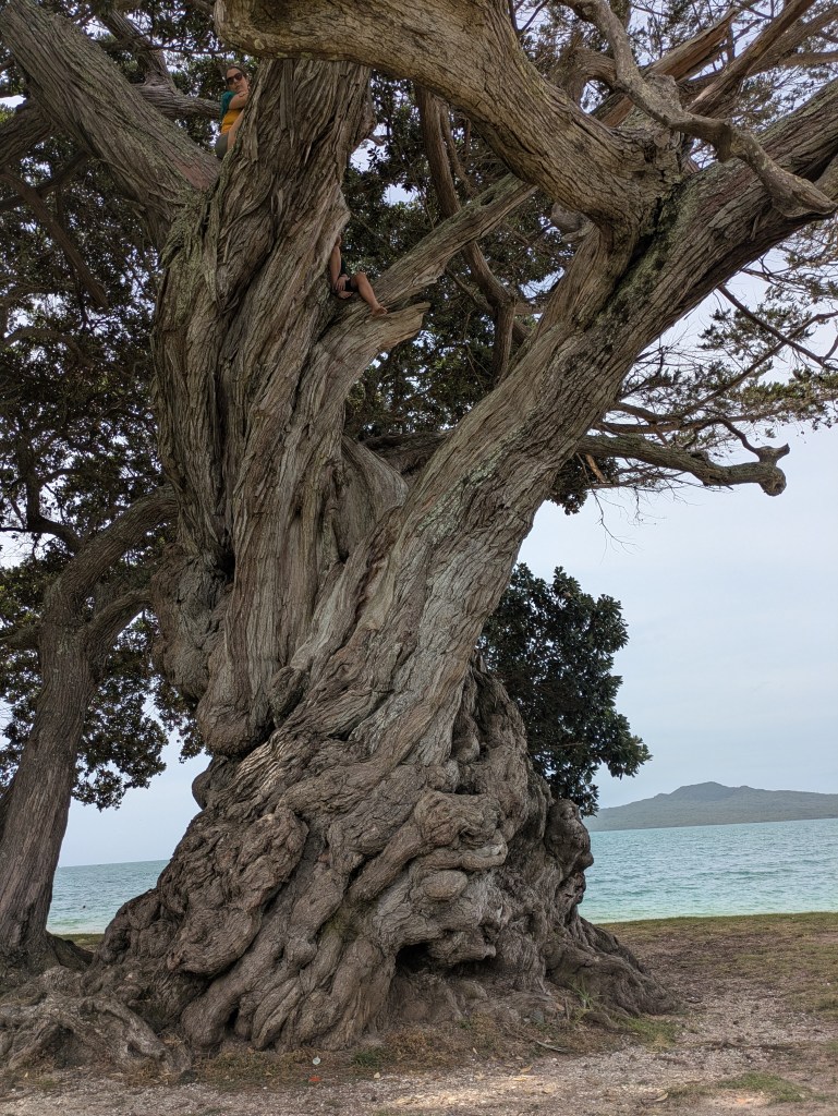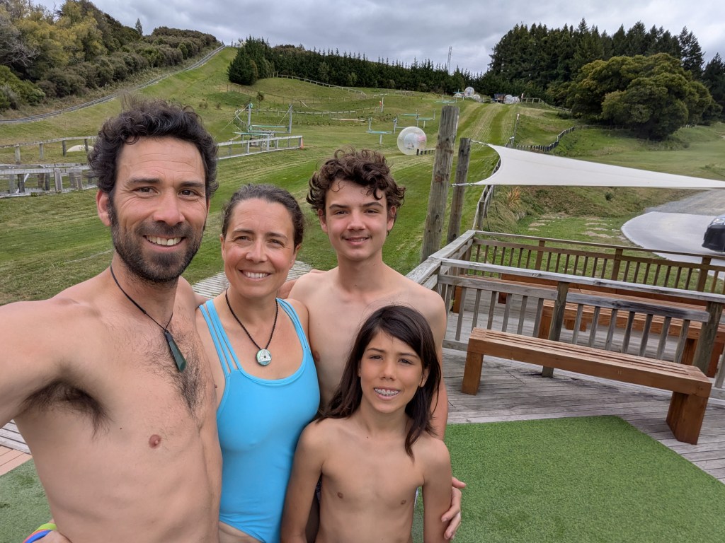 Blessed with the best-of-summer-tail weather, outdoor activities included climbing trees of all kinds (including a truly witchy Pohutukawa tree with a trunk spiralling up like a staircase), whizzing down Northhead grassy slopes on ripped-apart cardboard boxes sleds, surfing at Raglan’s Ocean beach, kayaking to pancakes rocks, playing with eels at the bottom of Bridal Veil falls, jumping off Raglan’s bridge, hiking Mount Karioi, as well as the Tama Lakes in Tongariro National Park, and Zorbing in Rotorua (the iconic kiwi touristic activity we hadn’t managed to do in fifteen years living in the country).